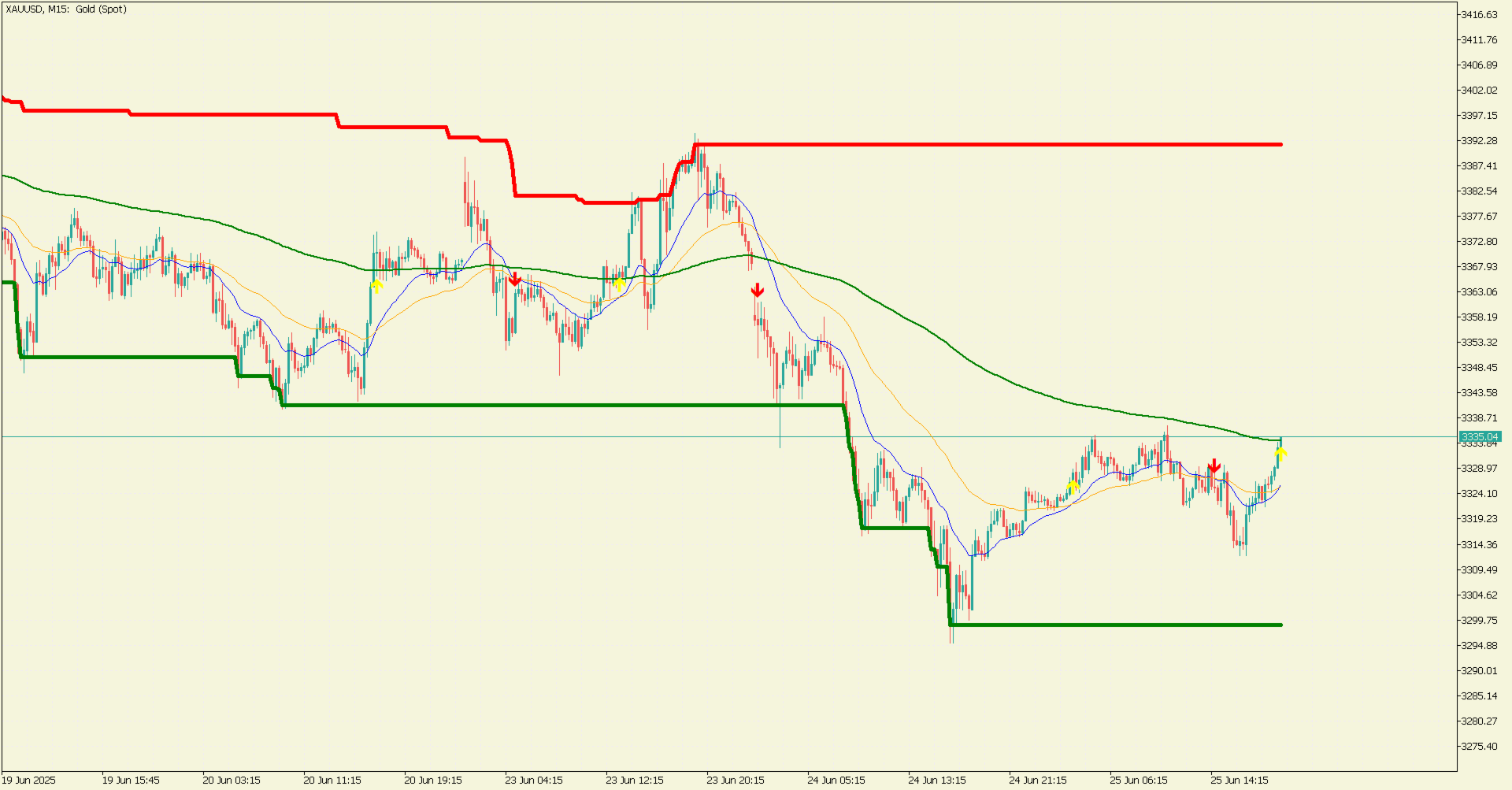 Niveles máximos y mínimos: Las líneas (rojas para el más alto, verdes para el más bajo) muestran los precios de cierre más altos y más bajos durante un periodo específico (por defecto: 200 barras), ayudando a identificar los niveles clave de soporte y resistencia.