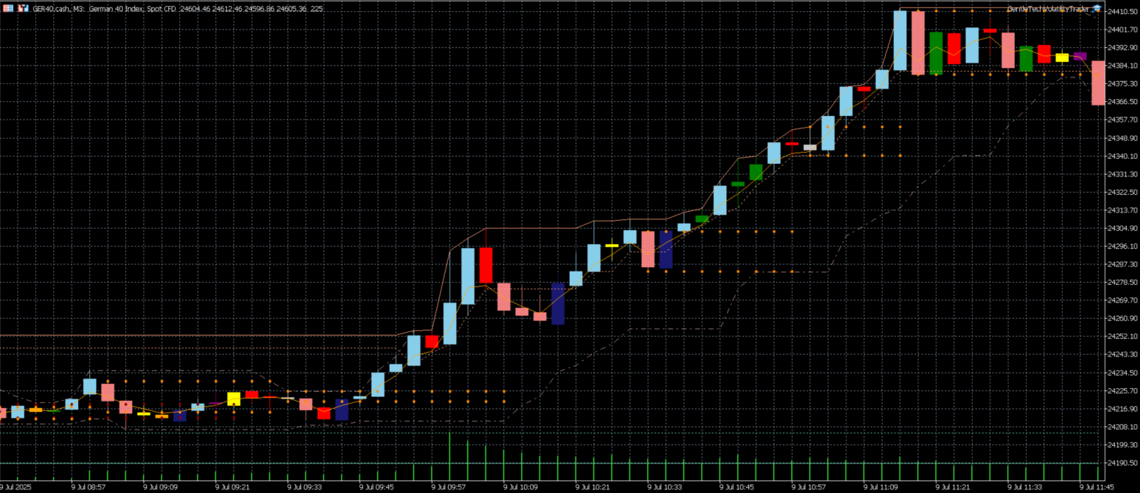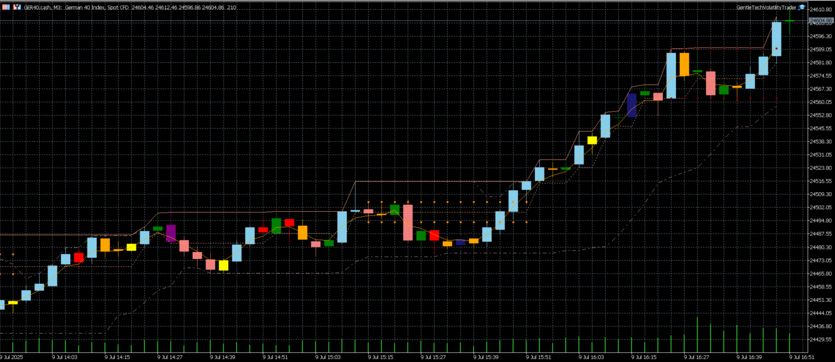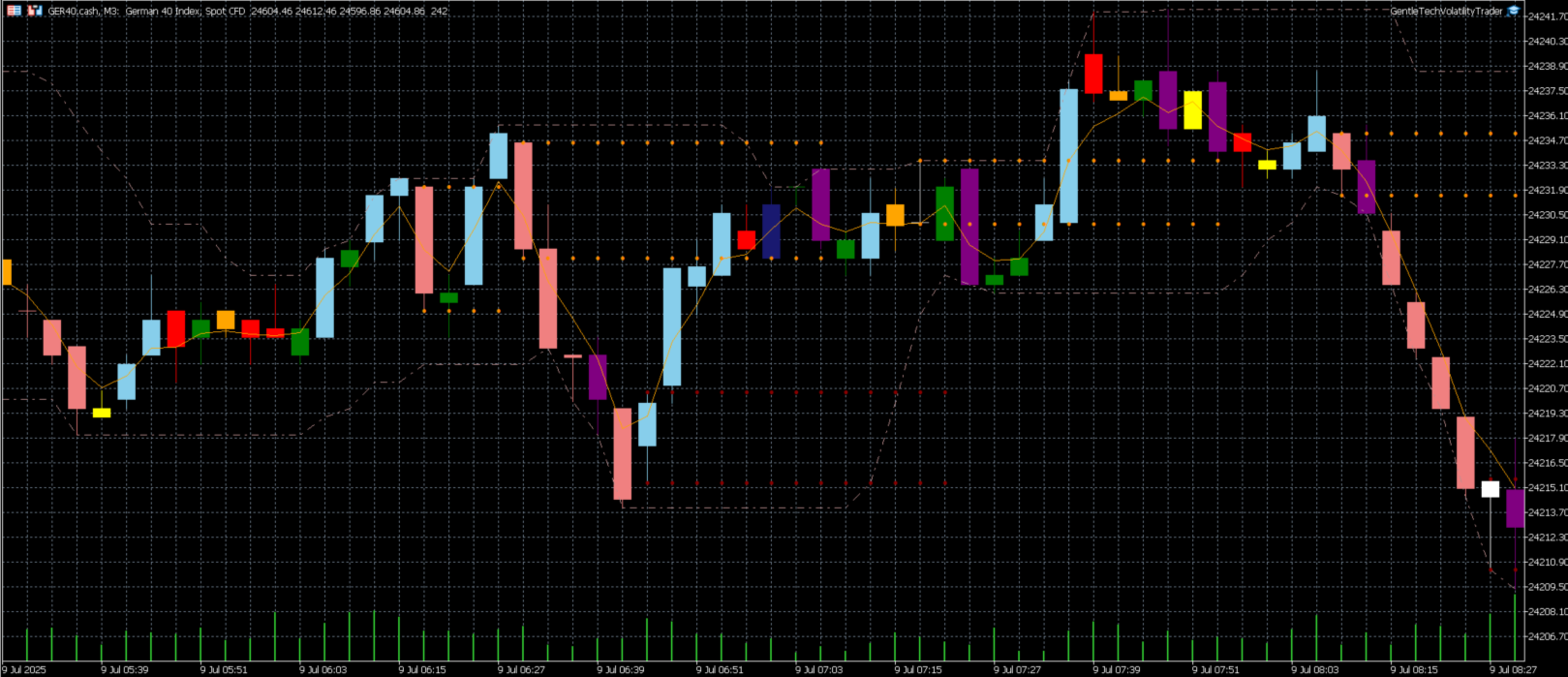 Detecta y codifica con colores patrones específicos de velas basados en la forma de la vela, posición relativa y filtros ATR.