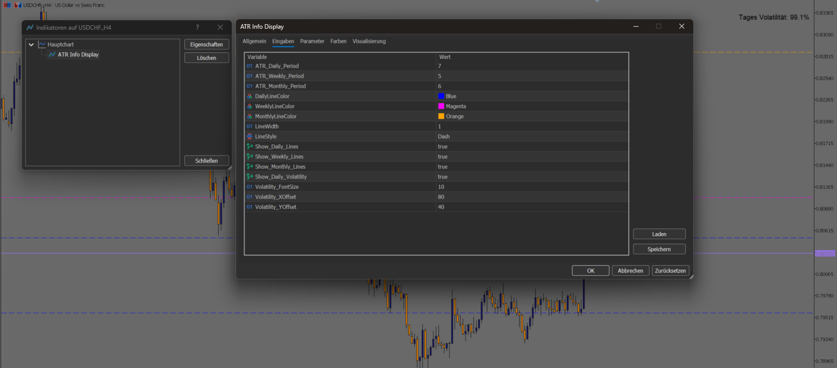 ATR Info Display es un indicador visual que calcula automáticamente el Rango Verdadero Promedio (ATR) en varios marcos temporales y lo muestra directamente en el gráfico.