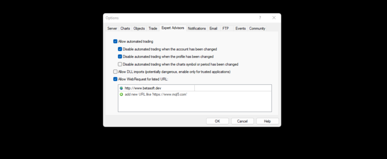 Si desea recibir notificaciones sobre la terminal EA, agregue la URL ( http://www.betasoft.dev ) MT4/MT5 (ver captura de pantalla).