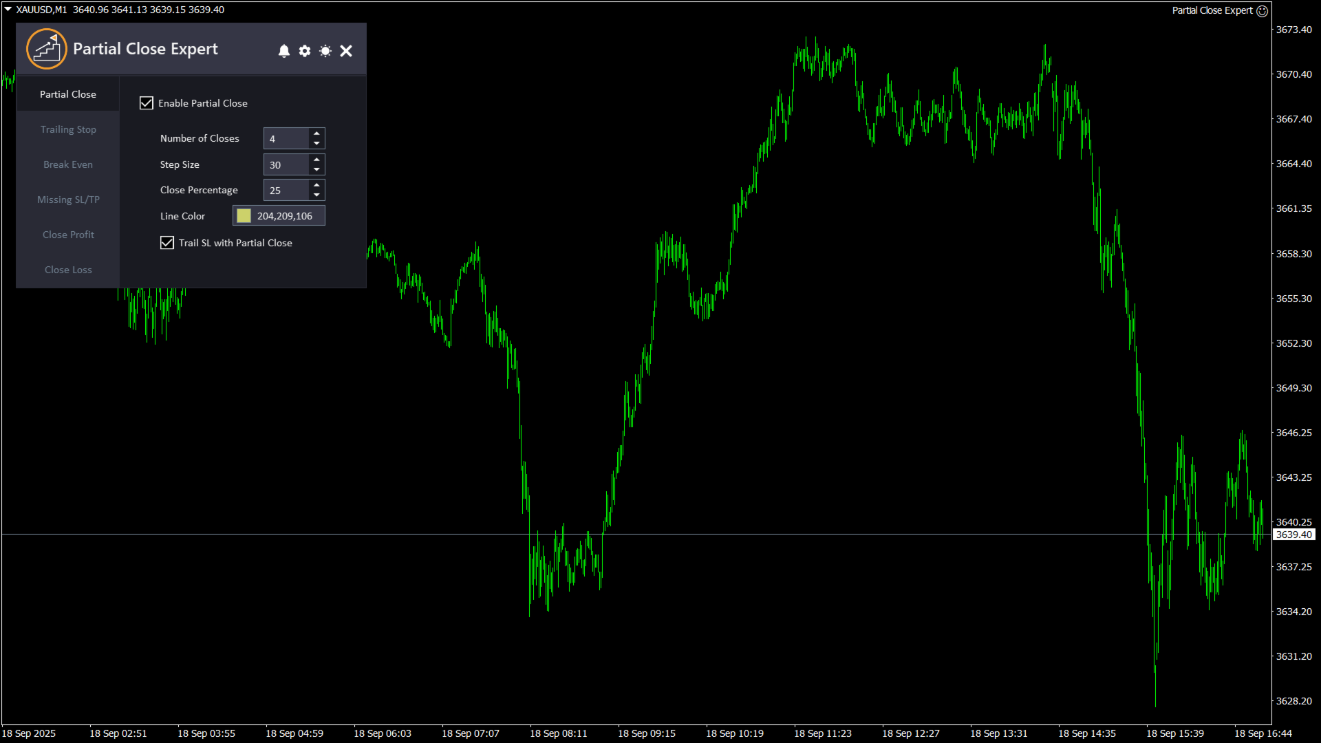 Con Partial Close Expert, los operadores pueden establecer un cierre parcial nivel para fijar ganancias, una stop dinámico nivel para proteger las ganancias y limitar las pérdidas, un punto de equilibrio nivel para garantizar que el comercio se mantendrá en equilibrio si el precio se mueve en su contra, y varias otras funciones.
