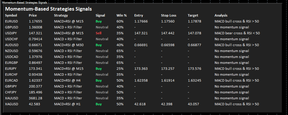 🎯 Estrategia de doble confirmación probada Nuestra estrategia no es una caja negra. Utiliza una combinación clásica de Cruce MACD confirmado por el Filtro de Tendencia RSI. Esta lógica robusta está diseñada para filtrar el ruido del mercado y capturar los verdaderos cambios de impulso.