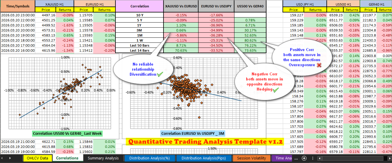 Esta hoja de cálculo de Excel (con automatización VBA) se conecta perfectamente con MT5 (o cualquier fuente de datos OHLCV) y transforma datos brutos en información práctica para el trading, con solo unos clics.