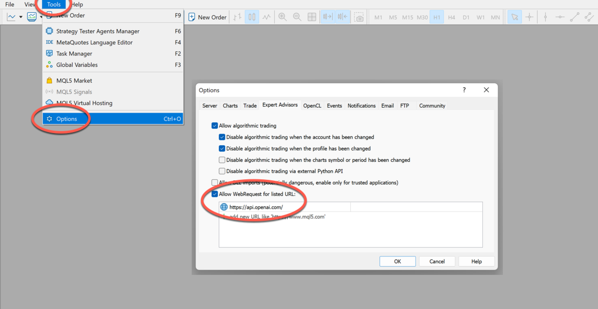 Usted tiene que permitir webrequests a los recursos OpenAI en la configuración de MetaTrader. Ver capturas de pantalla para más información.