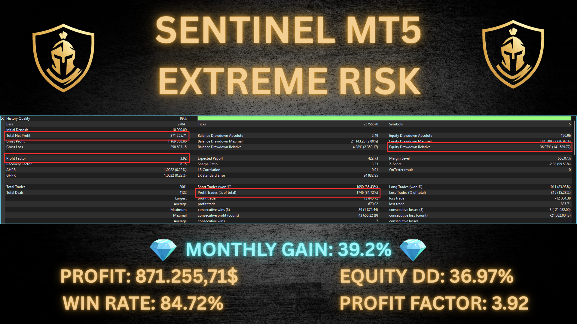 I have bought Sentinel MT5 in February 2026 and I have been using it on my live account since then, so I feel very confident to leave my review now. I could write long sentences on how great my experience has been with Sentinel MT5 and how well I feel about the performance, but I feel numbers speak more than words in trading. Below are my results from Feb 16th to April 8th, with a Medium risk : Net Return +14.43% Winrate 82.08% Profit Factor 3.24 Max Drawdown 1.87% Number of trades 240 On top of the positive results, Luca has shown his professionalism and has been very responsive to my questions. I 100% recommend his EA.