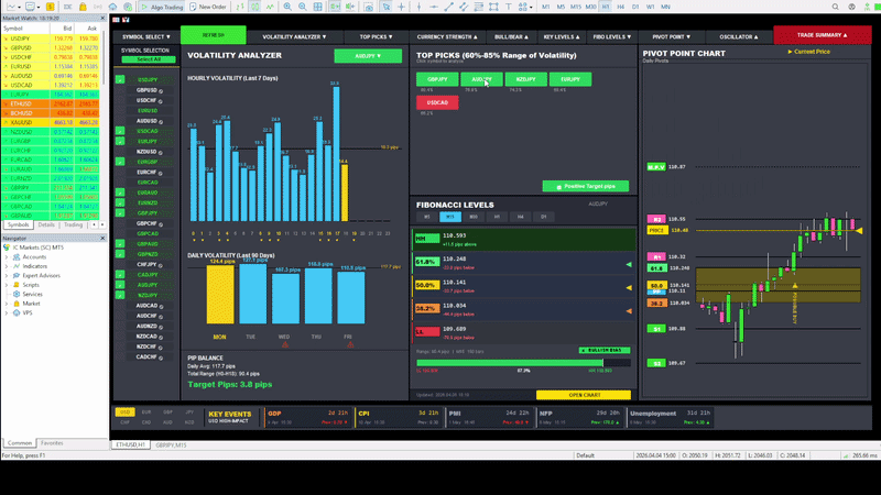 El indicador encuentra automáticamente buenas oportunidades de negociación y le muestra señales claras sobre cuándo comprar o vender. Funciona mejor cuando se combinan las tres herramientas juntas: análisis de volatilidad, fuerza de la divisa y osciladores.