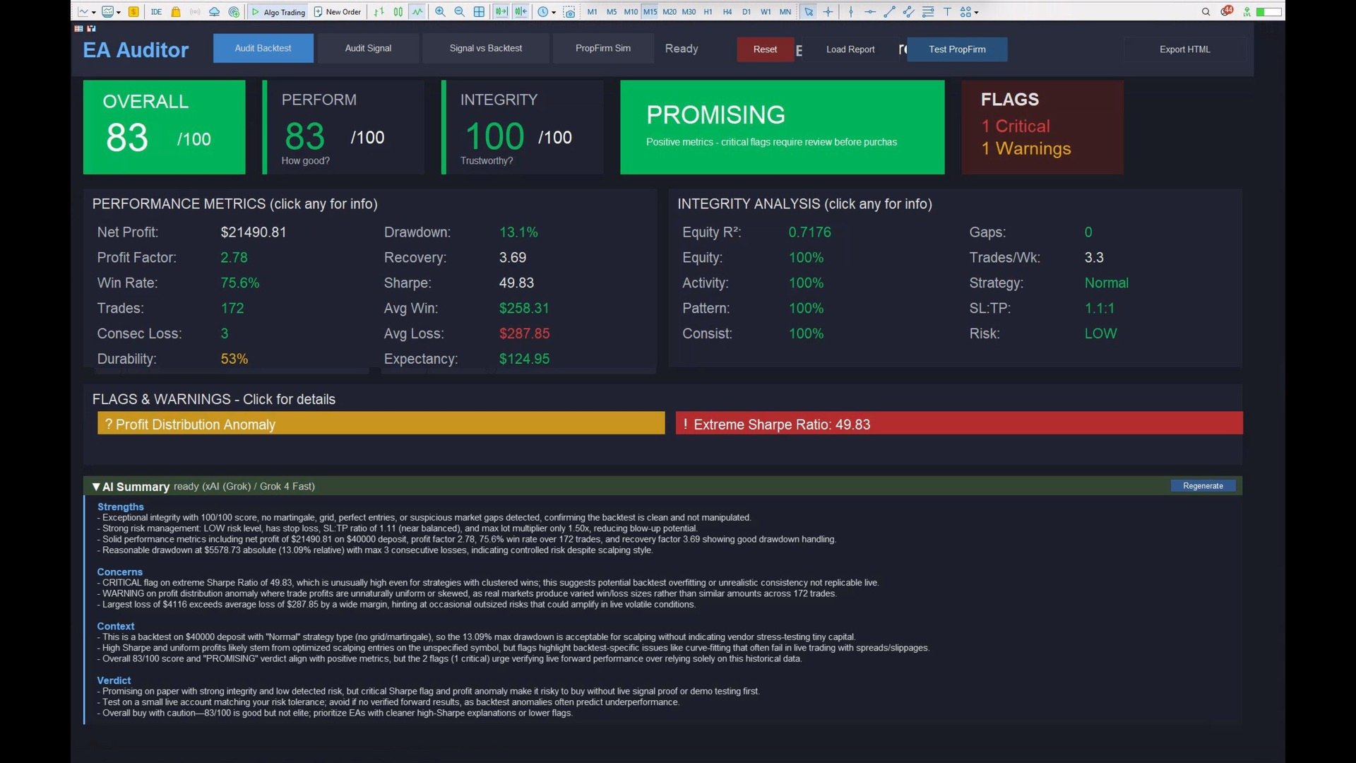 ▸ Lectores de historial y ajuste de curvas - Detección de compuestos mediante múltiples indicadores ▸ Estrategias Martingala - Progresión de lotes tras pérdidas con detección de multiplicadores ▸ Estrategias de cuadrícula - Acumulación de posiciones multinivel con recuento de niveles ▸ Métricas poco realistas - Sharpe, factor de recuperación, factor de beneficio demasiado buenos para ser verdad ▸ Stop Loss ausentes - Detecta operaciones que se ejecutan sin protección SL ▸ Amplios ratios SL:TP Ratios - Calcula la tasa de ganancias y fragilidad del punto de equilibrio ▸ Entradas perfectas - Operaciones en máximos/mínimos exactos (imposible en tiempo real)tiempo real) ▸ Curvas de equidad suaves - El análisis R² atrapa la equidad artificialmente lineal ▸ Evitar la caída del mercado - Señala EAs que dejaron de operar durante eventos importantes ▸ Sin rachas perdedoras - Patrones estadísticamente imposibles en secuencias de operaciones ▸ Distribución de beneficios - Resultados uniformes o sesgados que no coinciden con ▸ Dependencia de valores atípicos - Cuando una operación afortunada representa la mayor parte de los beneficios ▸ Análisis de durabilidad - Comprueba si los beneficios se distribuyen a lo largo del tiempo o se concentran ▸ Expectativa de operaciones - La ventaja matemática real por operación en dólares ▸ Confianza en el corredor - Califica al corredor de señales según su supervisión reguladora (sistema de 5 niveles)(sistema de 5 niveles) ▸ Context-Aware Flags - Vincula la tasa de ganancias al ratio SL:TP, PF al tipo de estrategia