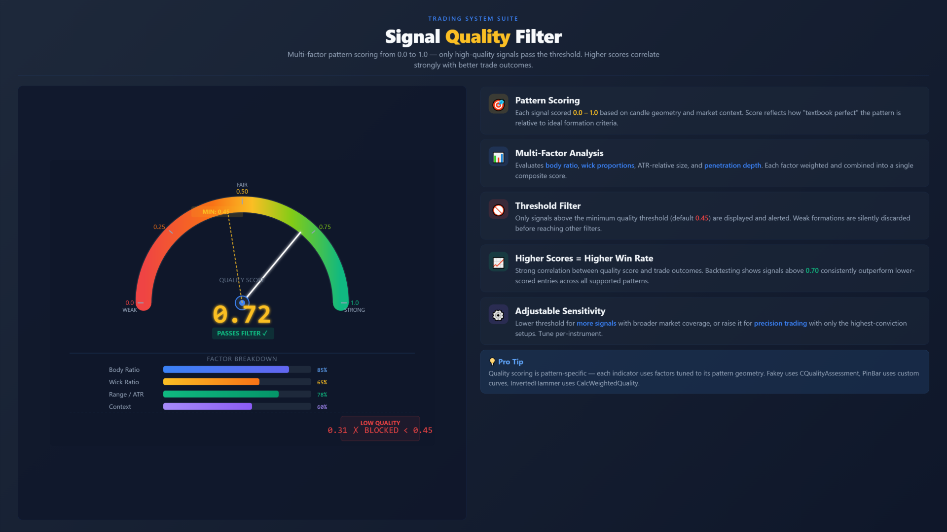 - Ajuste el umbral de la puntuación de calidad para controlar la frecuencia de las señales (más bajo = más señales, más alto = menos señales pero más fuertes)
