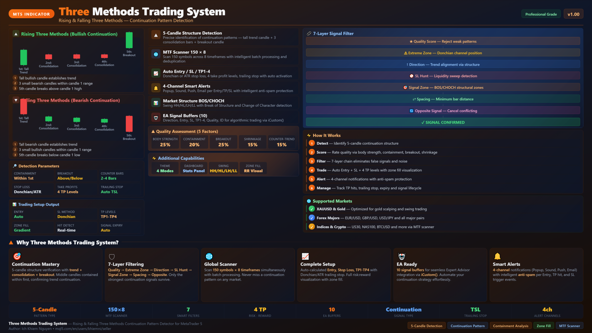 El Sistema de Trading de Tres Métodos detecta formaciones de Tres Métodos alcistas (continuación alcista) y Tres Métodos bajistas (continuación bajista) en cualquier símbolo y marco temporal. Cada patrón detectado recibe niveles automatizados de Entrada, Stop Loss y hasta 4 niveles de Take Profit (TP1-TP4) dibujados directamente en el gráfico. Un escáner multi-marco temporal incorporado monitoriza hasta 150 símbolos a través de 8 marcos temporales simultáneamente. MANUAL