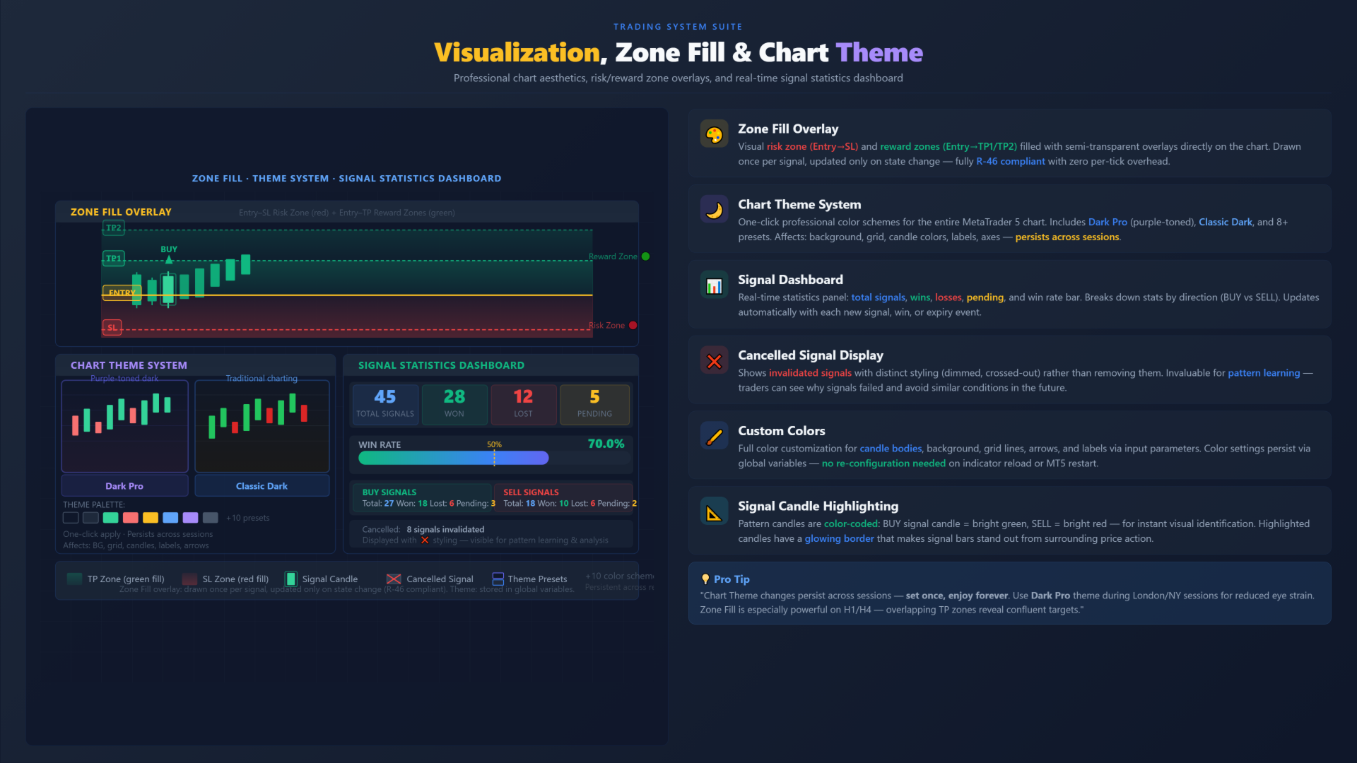 - Filtro de zonas extremas - Bloquea las señales cercanas a zonas de sobrecompra/sobreventa utilizando umbrales de posición del Canal de Donchian