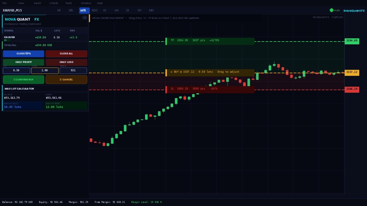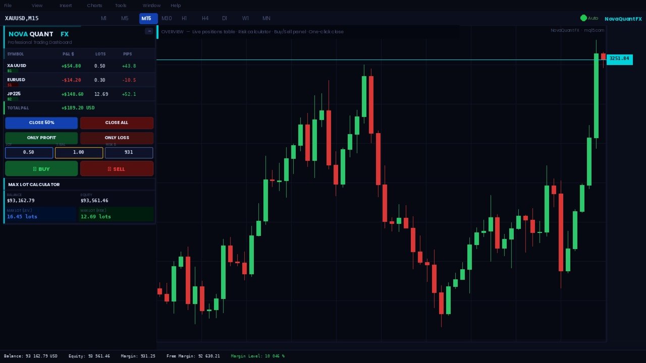 NovaQuant FX es un robot de comercio automatizado (Asesor Experto) desarrollado para el mercado Forex en la plataforma MetaTrader 5. Está diseñado para ejecutar operaciones basadas en condiciones técnicas predefinidas, manteniendo una gestión estructurada del riesgo y una ejecución disciplinada de las operaciones.