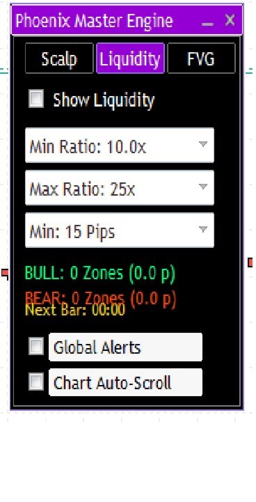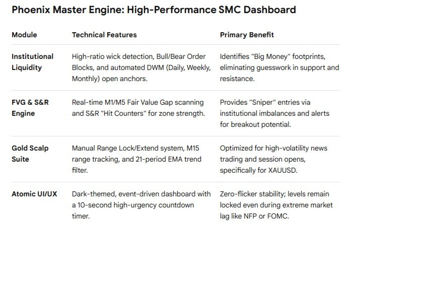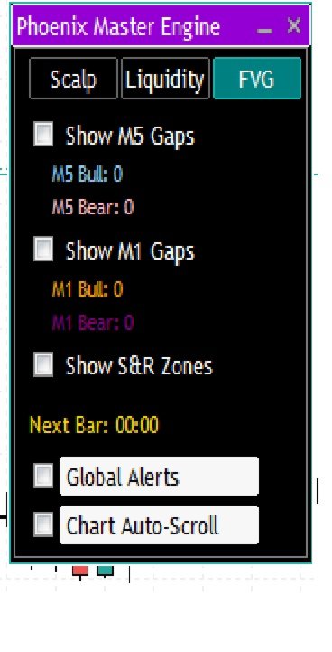 Phoenix Master Engine v3 es un panel multiestratégia de grado institucional para MetaTrader 5. Consolida tres metodologías de alta probabilidad: Scalping de Oro, Liquidez Institucional y Análisis de FVG.