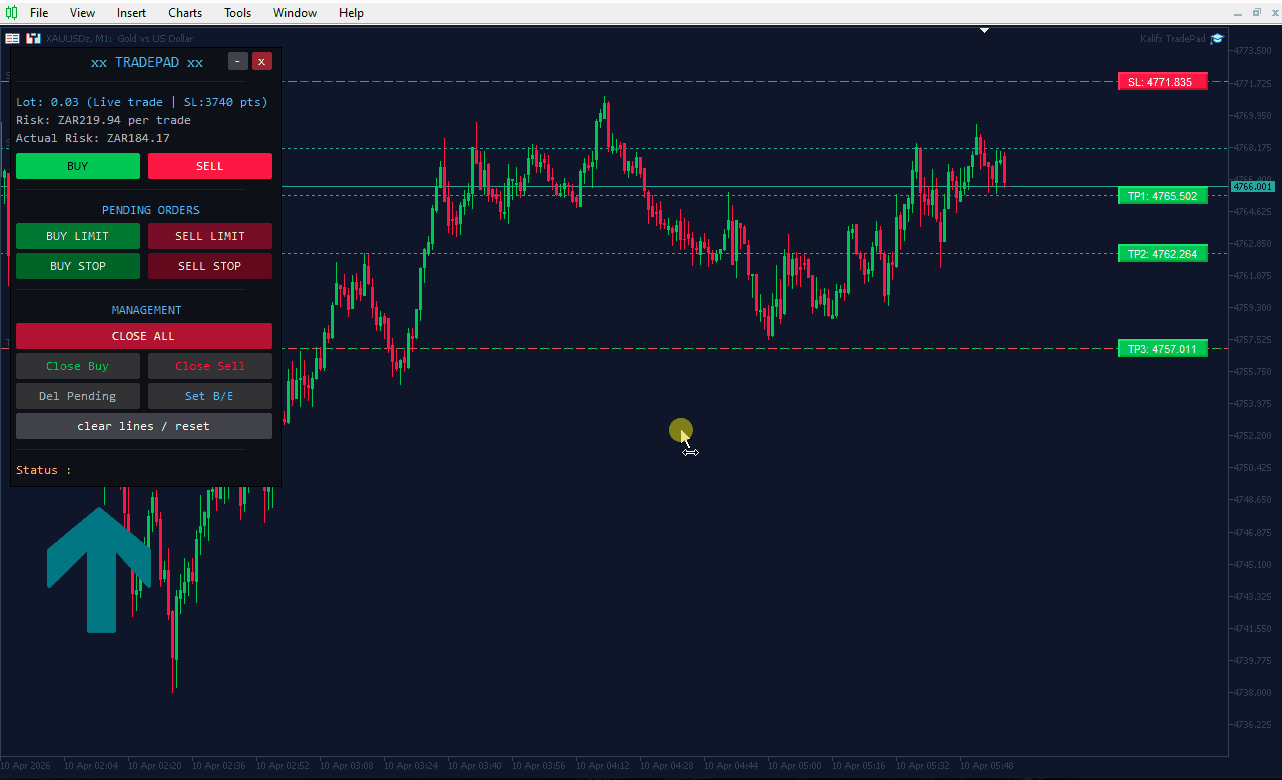 Kalifx TradePad es un panel de negociación inteligente y fácil de usar para MetaTrader 5 diseñado para simplificar la ejecución de operaciones, la gestión de riesgos y el control de órdenes directamente desde el gráfico. En lugar de calcular manualmente el tamaño de los lotes, el stop loss o la toma de beneficios, TradePad permite a los operadores preparar visualmente las operaciones mediante líneas ajustables antes de enviar la orden.