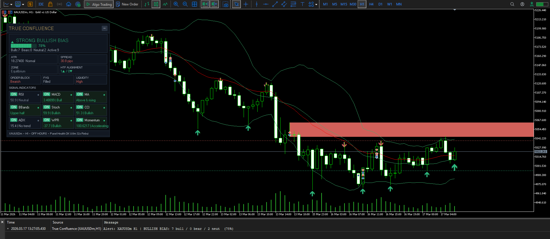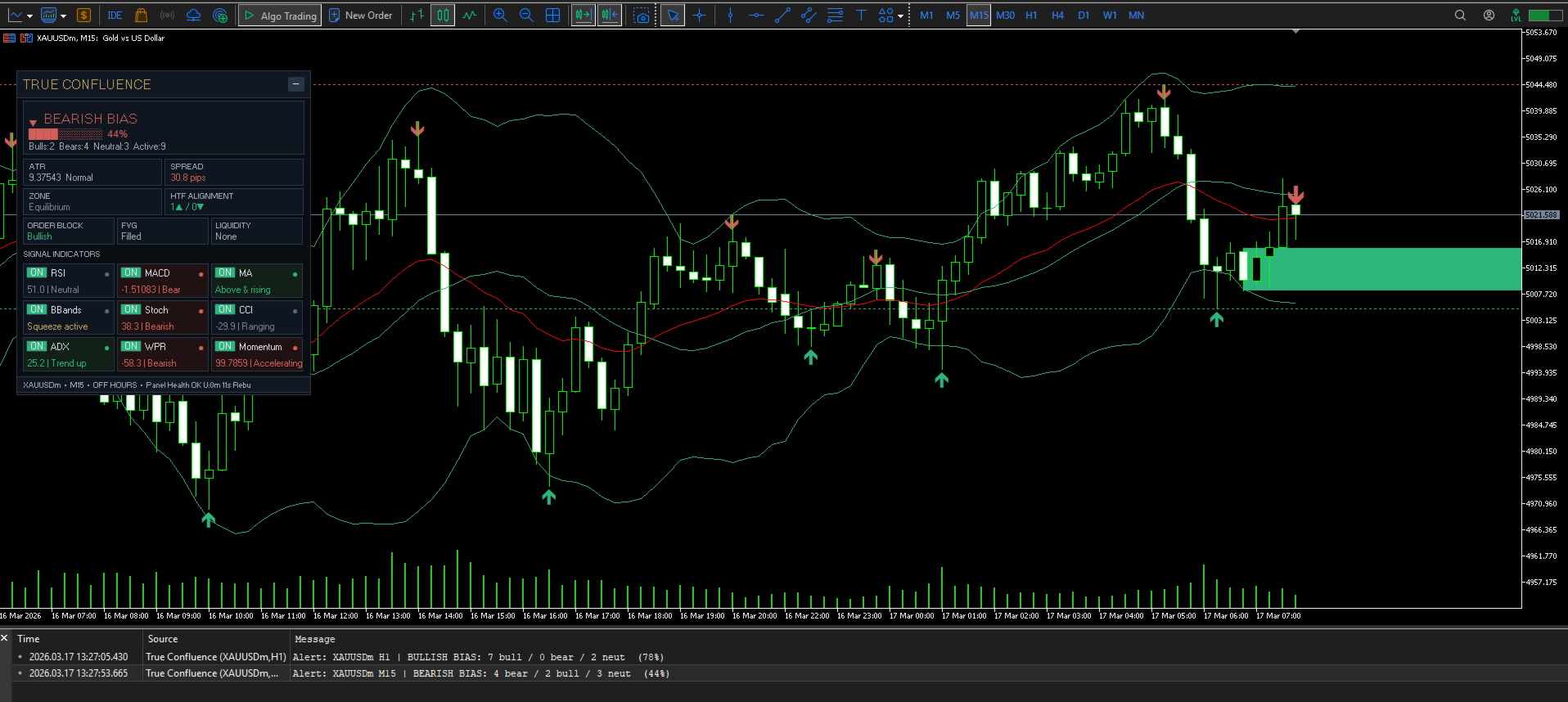 En lugar de comprobar varias herramientas por separado, True Confluence reúne el análisis técnico, la alineación de señales, la lectura del impulso y el contexto más amplio del mercado en un sencillo panel visual.