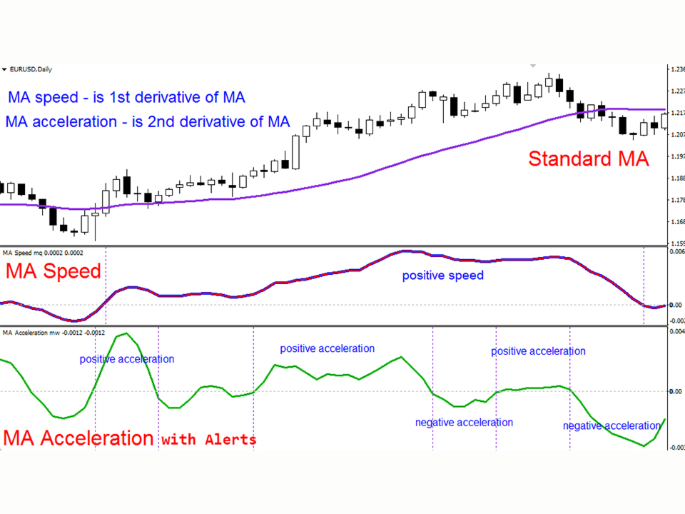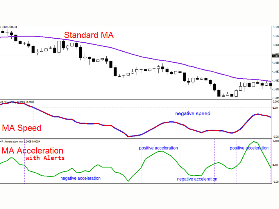 - Si el valor del indicador MA Acceleration es < 0: la velocidad de la MA aumenta en dirección bajista; si el valor del indicador MA Acceleration es > 0: la velocidad de la MA aumenta en dirección alcista.