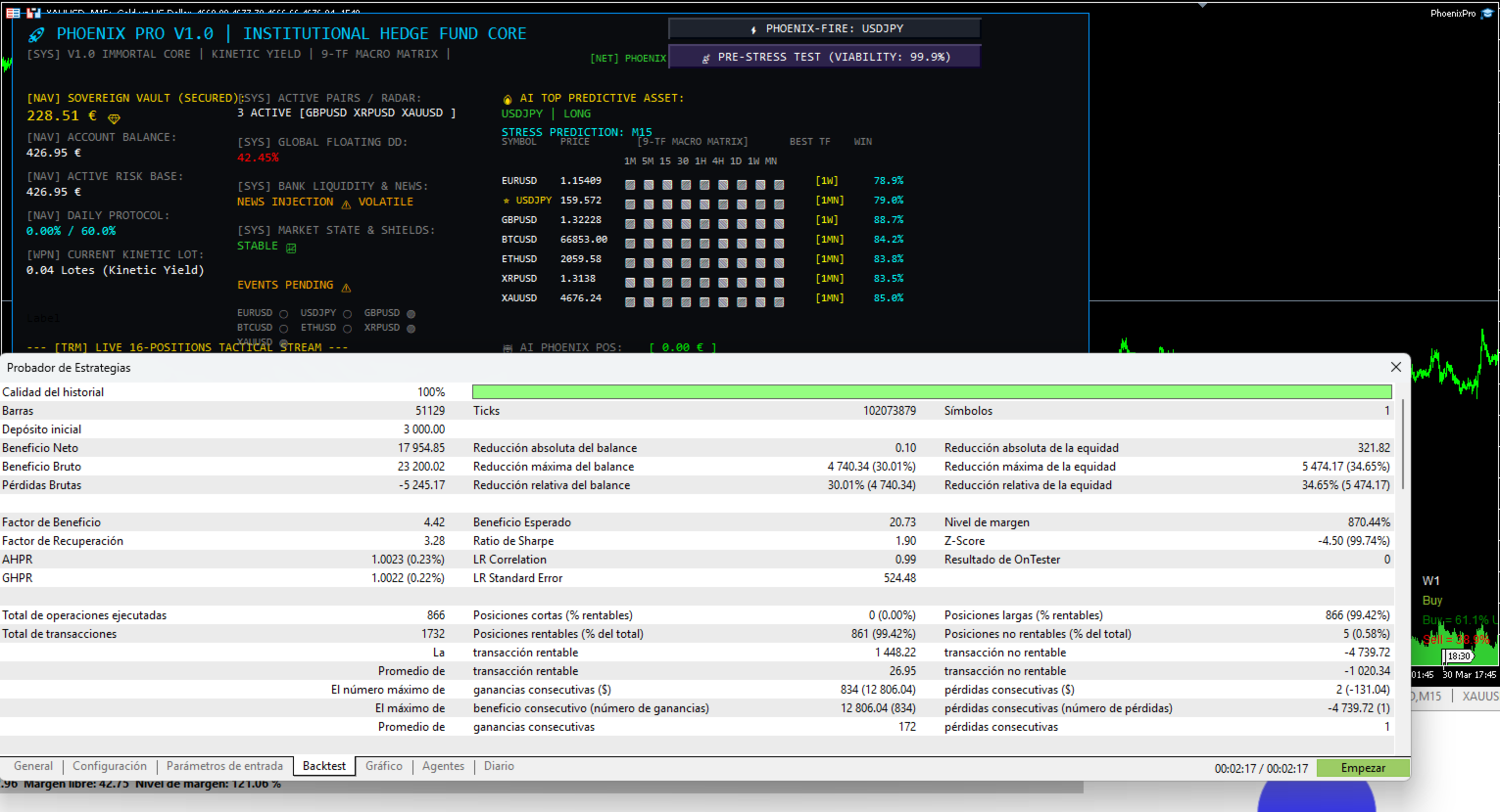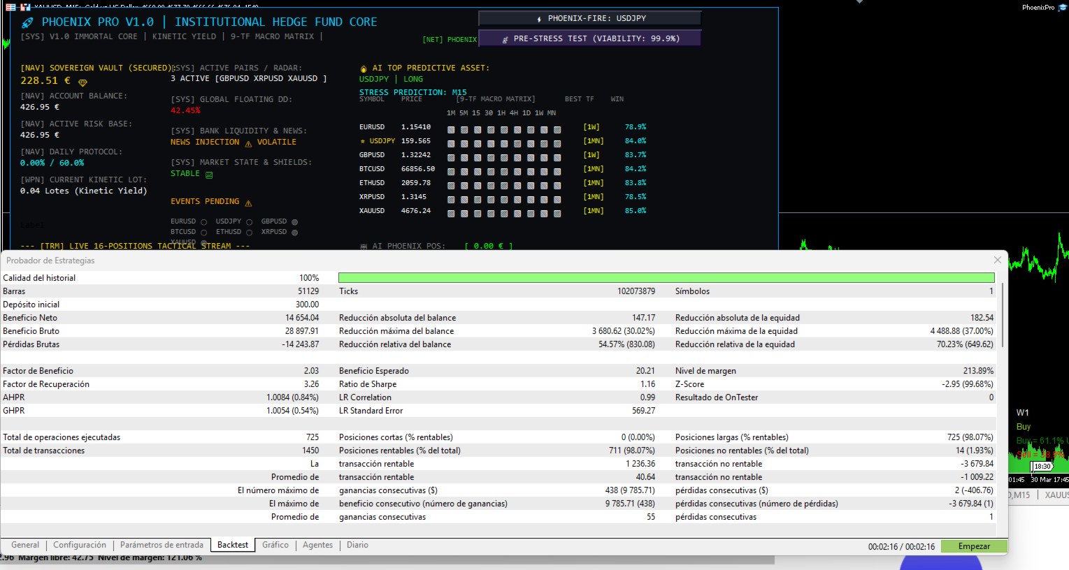 Protección Dinámica de Equidad (Trailing Profit Shield): A diferencia de los bots convencionales con objetivos fijos, Phoenix Pro "persigue" las ganancias. Si una operación entra en un movimiento explosivo a su favor, el sistema activa un blindaje que asegura el 80% del beneficio máximo alcanzado, permitiendo que el 20% restante siga buscando objetivos mayores.