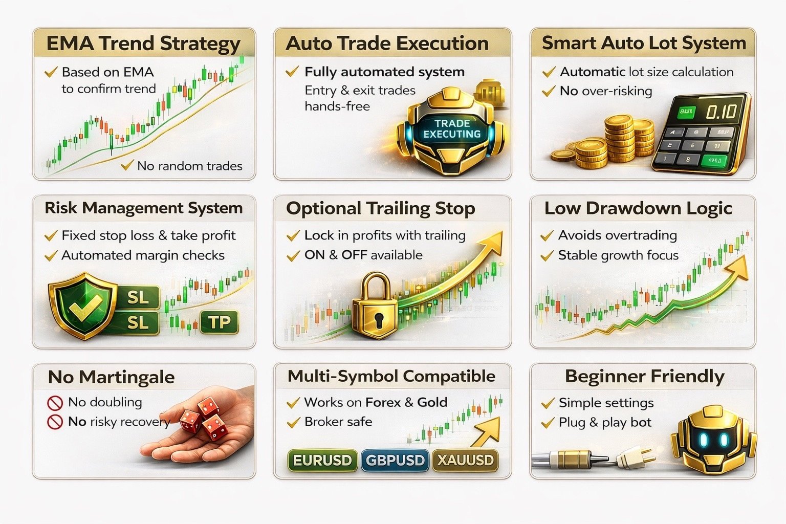 Este bot se centra en movimientos de tendencia limpios y evita operaciones innecesarias, por lo que es adecuado tanto para principiantes como para traders experimentados.
