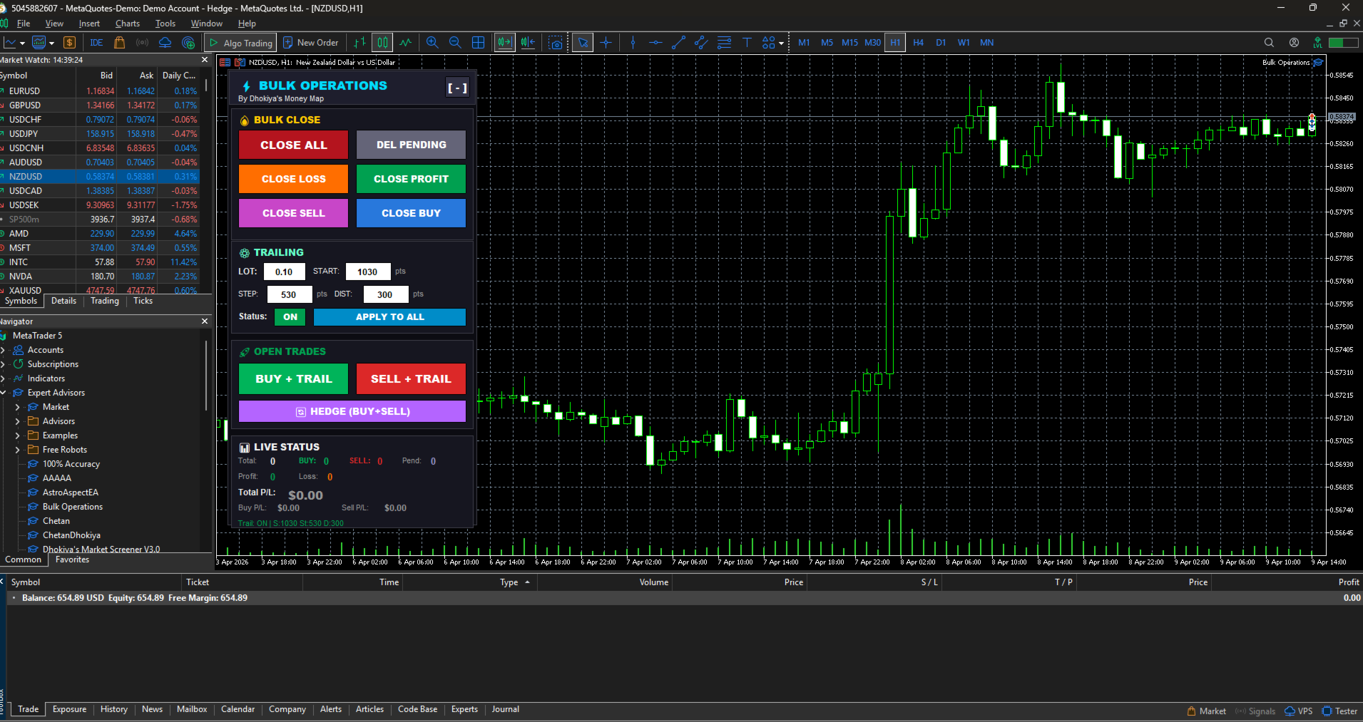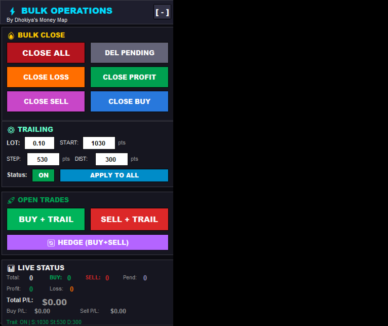Panel de Operaciones Masivas para MetaTrader 4 es una herramienta de gestión de operaciones limpia y eficiente que ayuda a los traders a controlar múltiples posiciones más rápido, gestionar trailing stops con mayor facilidad, ejecutar acciones de hedge y supervisar el estado del trading en tiempo real desde un solo panel profesional en el gráfico.