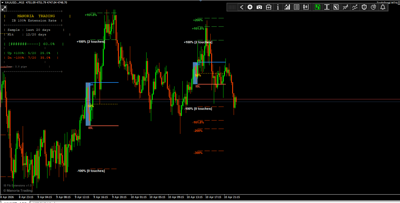 Este indicador traza automáticamente el Balance Inicial (8:30-9:30 EST) sesión cada día y proyecta extensiones de Fibonacci por encima y por debajo de ella - entonces le dice estadísticamente con qué frecuencia el precio alcanza cada extensión 100% basado en sus propios datos históricos.