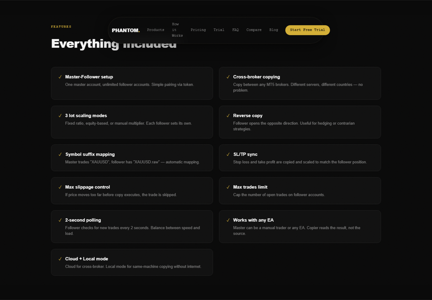 PHANTOM Copier lo soluciona. Una cuenta maestra envía todas las operaciones - aperturas, modificaciones, cierres - a cualquier número de cuentas seguidoras. A todos los brokers. A través de terminales. En tiempo real.