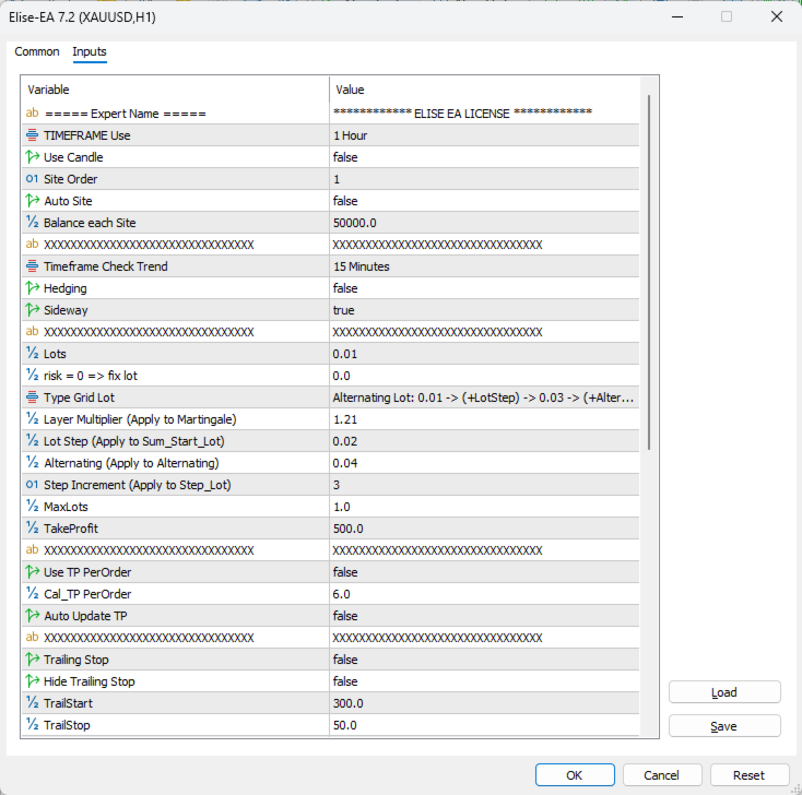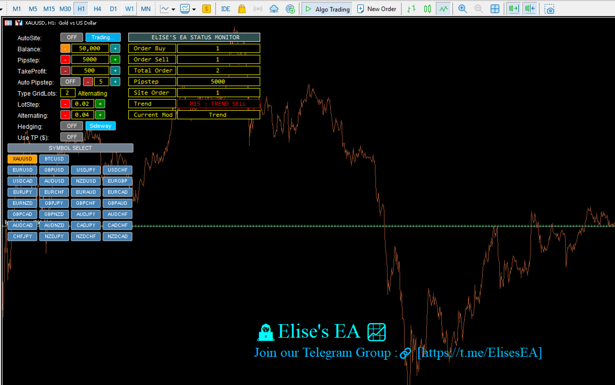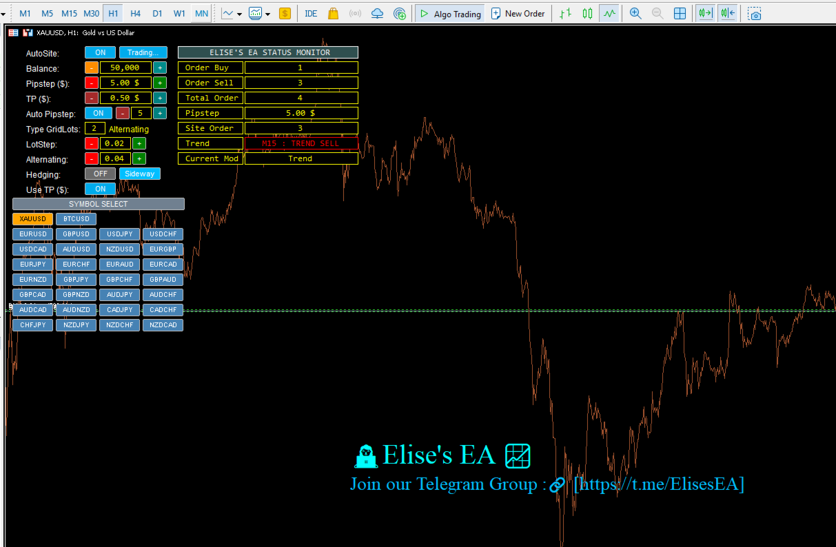 Elise-EA es un Asesor Experto multicapa para MetaTrader 5, optimizado para XAUUSD (Oro) en el marco temporal H1. Abre una primera operación en la dirección de la tendencia detectada y, a continuación, añade órdenes posteriores a medida que el mercado se mueve en contra de la posición, con el objetivo de obtener un beneficio combinado. Un panel de control interactivo en el gráfico le permite ajustar todos los parámetros clave en tiempo real sin reiniciar el EA.