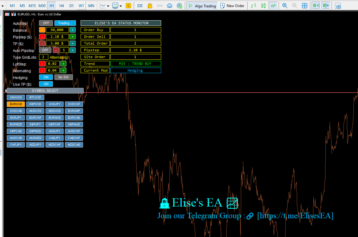 Elise-EA utiliza una estrategia de negociación de cuadrícula. La negociación de cuadrícula implica la apertura de múltiples órdenes a medida que el precio se mueve en contra de la posición inicial, lo que puede resultar en una reducción significativa o en una demanda de margen si el mercado tiende fuertemente sin reversión. El rendimiento pasado no es indicativo de resultados futuros. Nunca opere con capital que no pueda permitirse perder. Pruebe siempre a fondo en una cuenta de demostración antes de utilizarla en una cuenta real. El autor no se responsabiliza de las pérdidas financieras ocasionadas por el uso de este software.