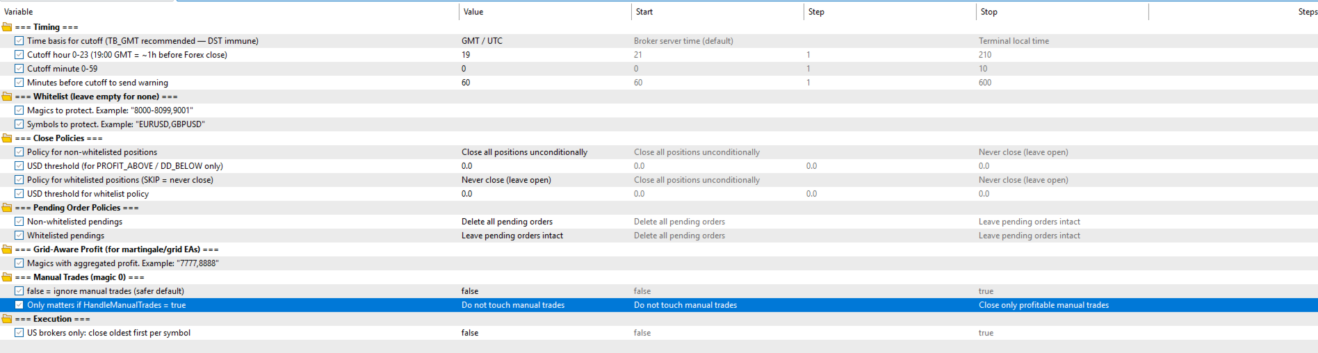 Cierre posiciones, elimine pendientes y apague los gráficos de los EAs en un corte configurable del viernes. Disfrute de un fin de semana sin preocupaciones.