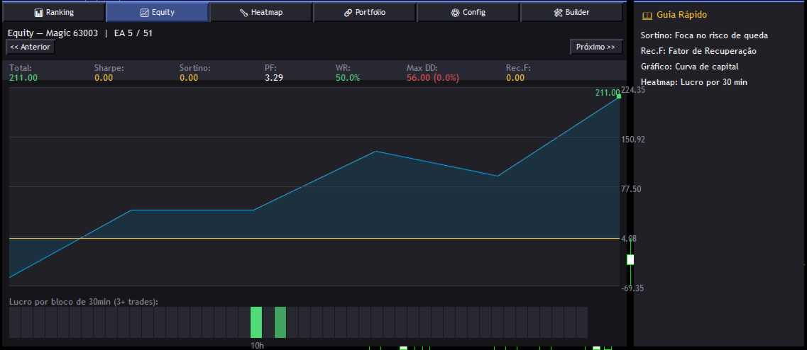 - Mapa térmico de rentabilidad (30 min): Mapa de calor visual que cruza los días de la semana con las horas del día. Descubra visualmente las horas doradas y las horas sangrantes de cada EA.