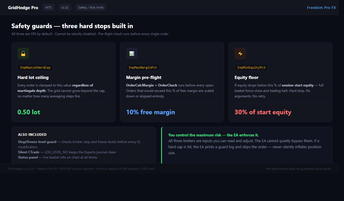 Estricto control del riesgo. Tres limitadores incorporados (lote, margen, equidad) con verificación explícita previa antes de cada orden - usted establece los límites superiores de riesgo, el Asesor Experto no los cruza.