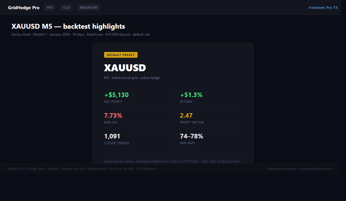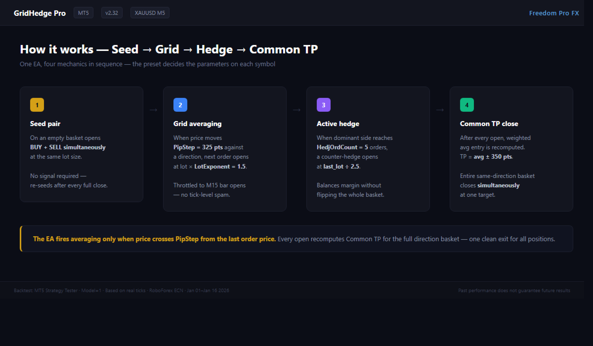 GridHedge Pro es un asesor especializado MT5 construido sobre la pila de investigación del equipo de Freedom Pro FX. El algoritmo implementa una estrategia grid-martingale bidireccional con cobertura activa - entra en el mercado simultáneamente en ambas direcciones, promedia cuando se mueve en contra de una posición, cubre el lado sesgado de la cesta y cierra todo de acuerdo con el Take Profit total. Sin esperar señales. Sin predecir la dirección.