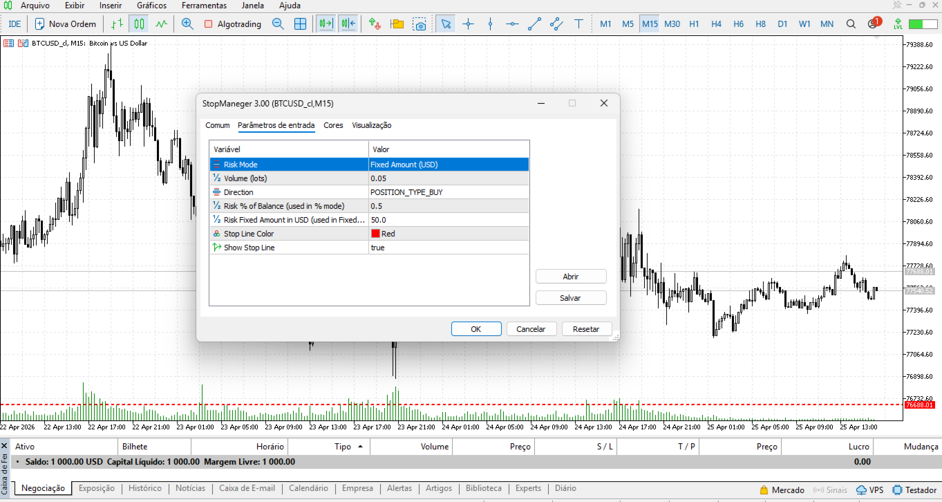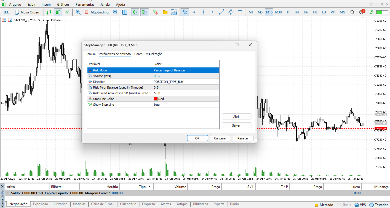 Seleccione el modo de riesgo, ingrese el volumen en lotes, elija la dirección (Compra o Venta) y defina cuánto desea arriesgar. El indicador dibuja instantáneamente una línea roja discontinua que muestra el nivel de precio donde se activaría su stop.