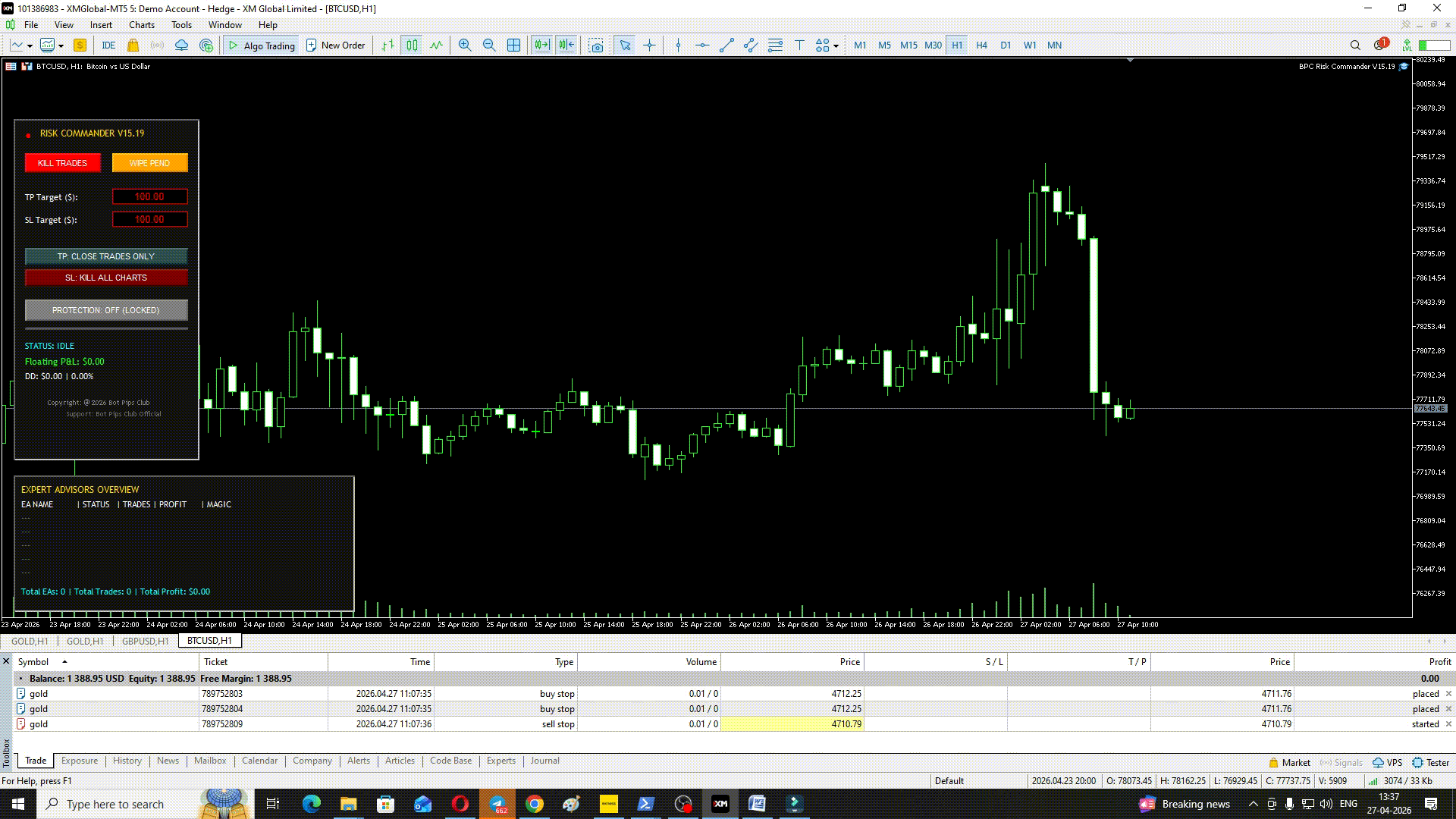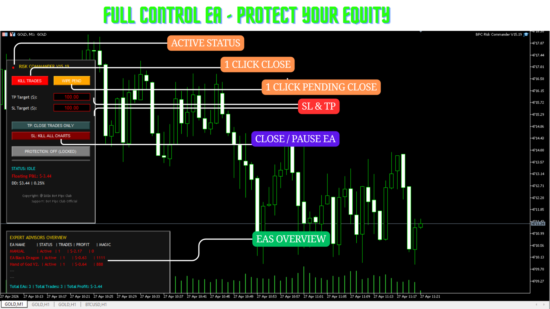 (b) Kill All Charts - Cerrará todas las operaciones (Pendientes y en ejecución), también cerrará el gráfico y eliminará los EAs. Es una capa de protección extra.