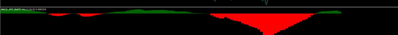 the Macd Multi Timeframe shows the MACD-values of higher timeframes on lower timeframes. The parameter referenceTF has default value H4. Therefore, the indicator will show the MACD values of the H4 timeframe on lower timeframes. The lower you go with the timeframe of the chart the bigger and more pixeled the value of the indicator gets.