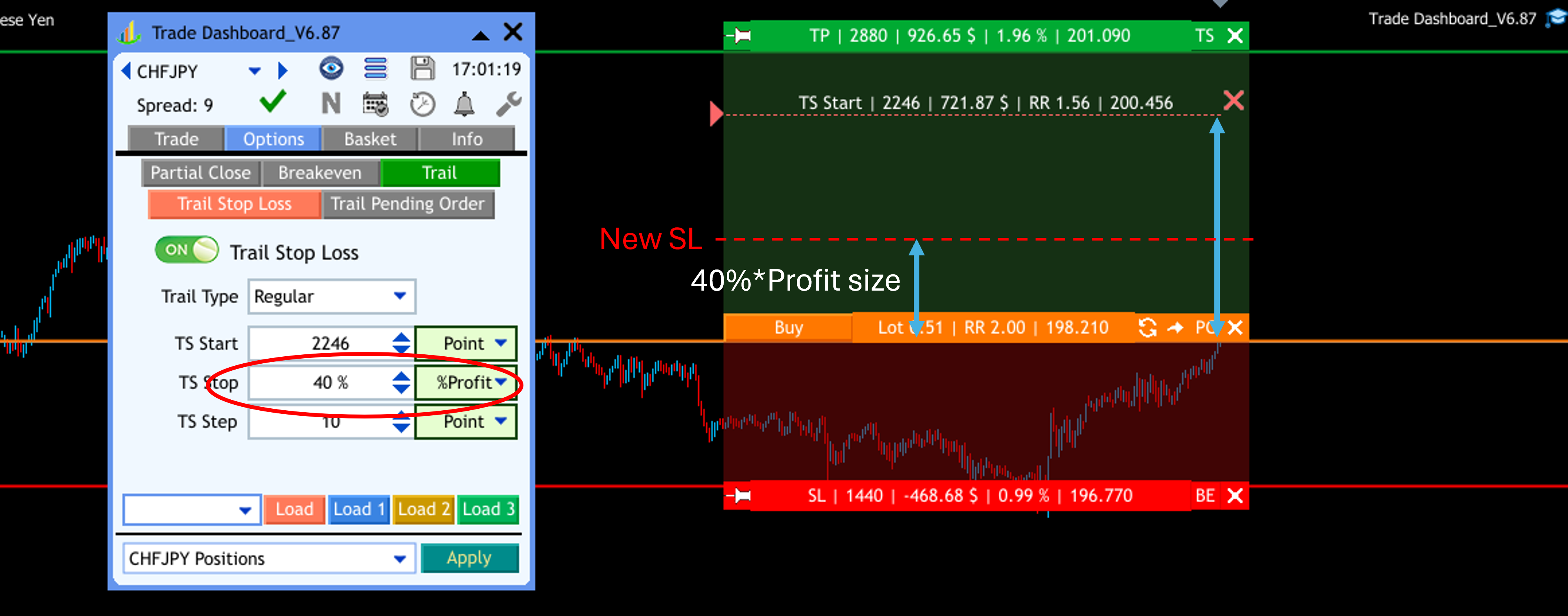 If Trail Stop = 40%, the Stop Loss will always trail at 40% of the current profit, instead of using a fixed value.