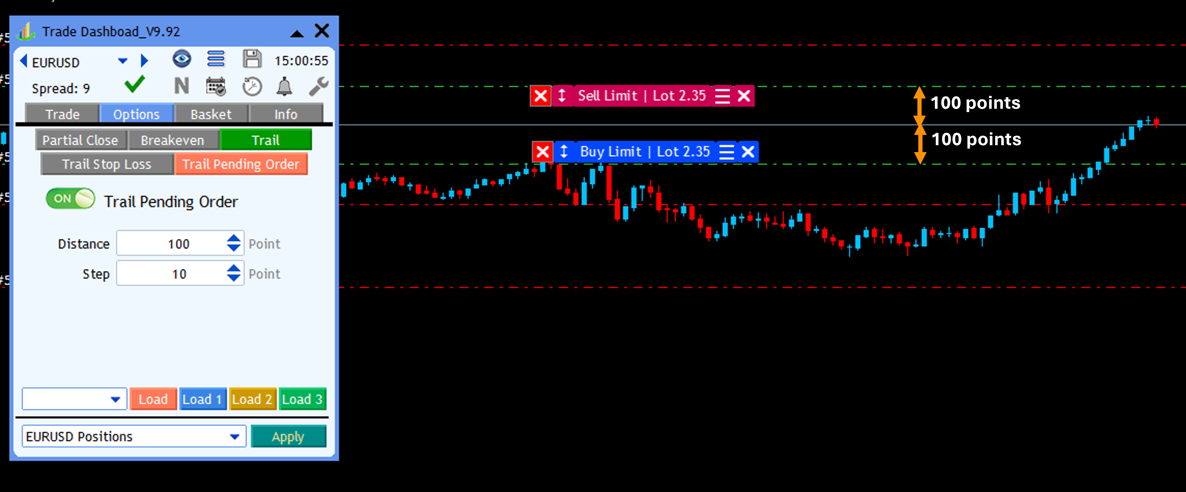 Trade Dashboard keeps the pending order no more than 100 points away from the current market price