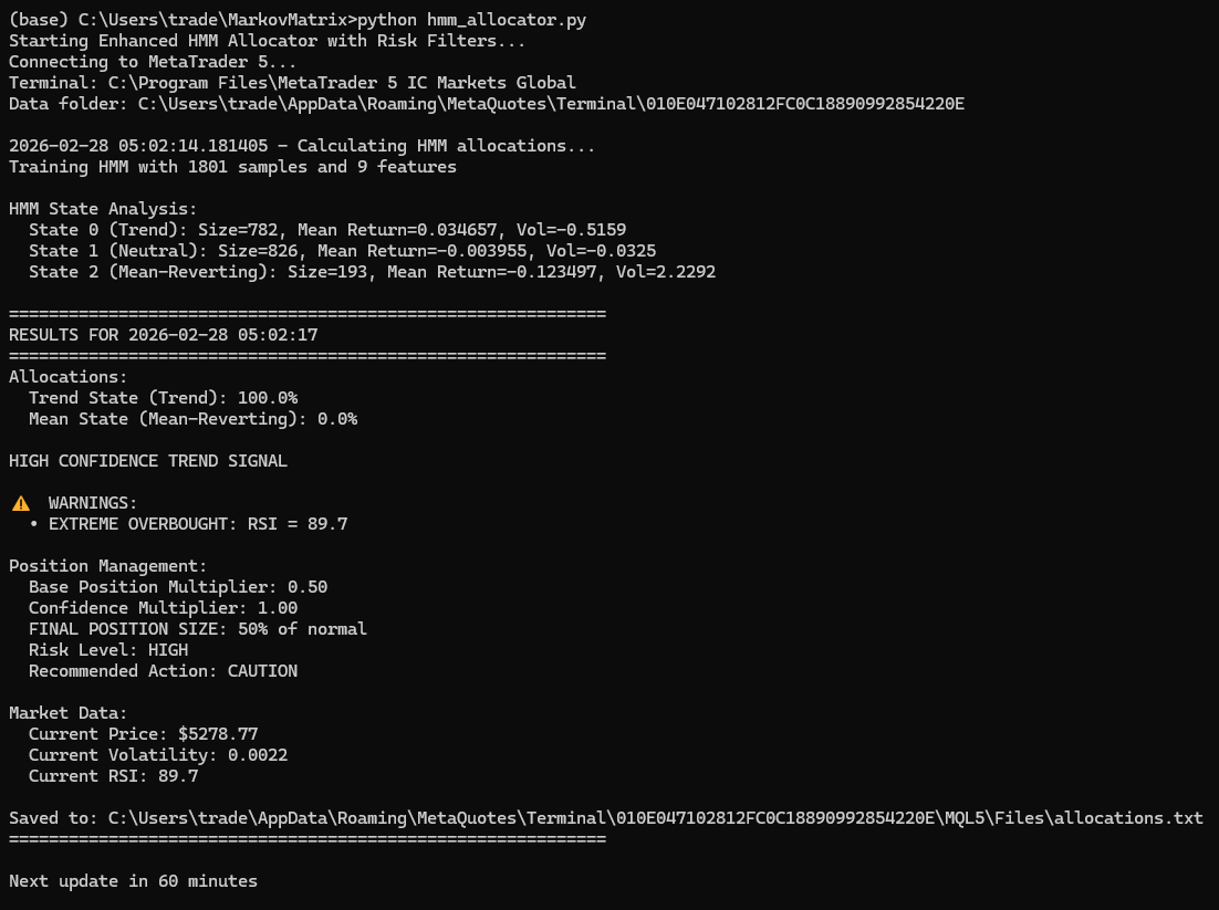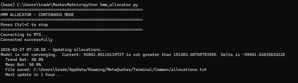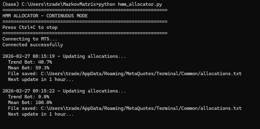 The HMM detected a strong mean-reversion environment and is now betting fully on the mean bot.