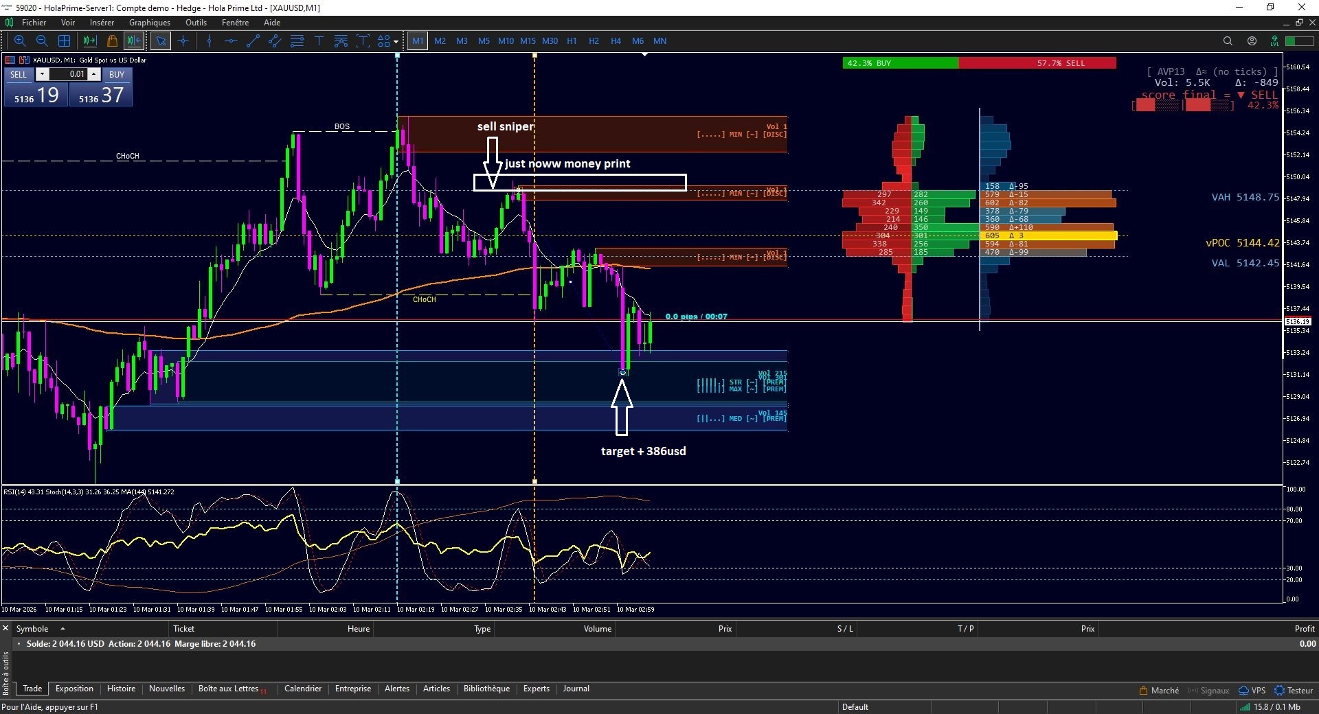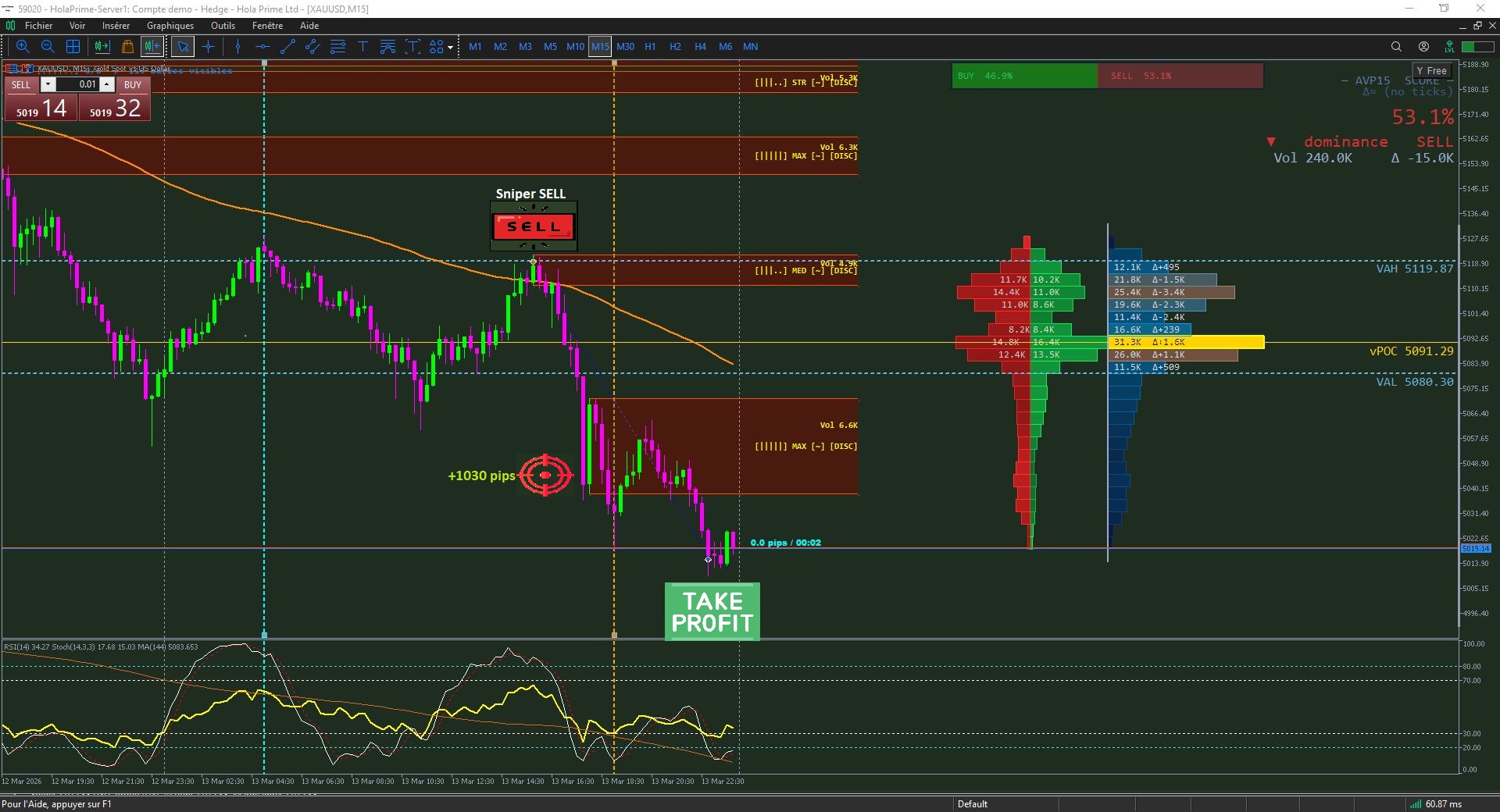 C'est là que le signal devient "Sniper". Au moment exact où le prix touchait 5118-5119, notez l'indicateur de Delta Volume à droite. Nous observons un pic massif d'ordres de vente agressifs (barres rouges longues, valeurs Delta négatives) qui rejette le prix. Le score de "dominance SELL" confirmait le biais vendeur. C’était le signal clair pour vendre.