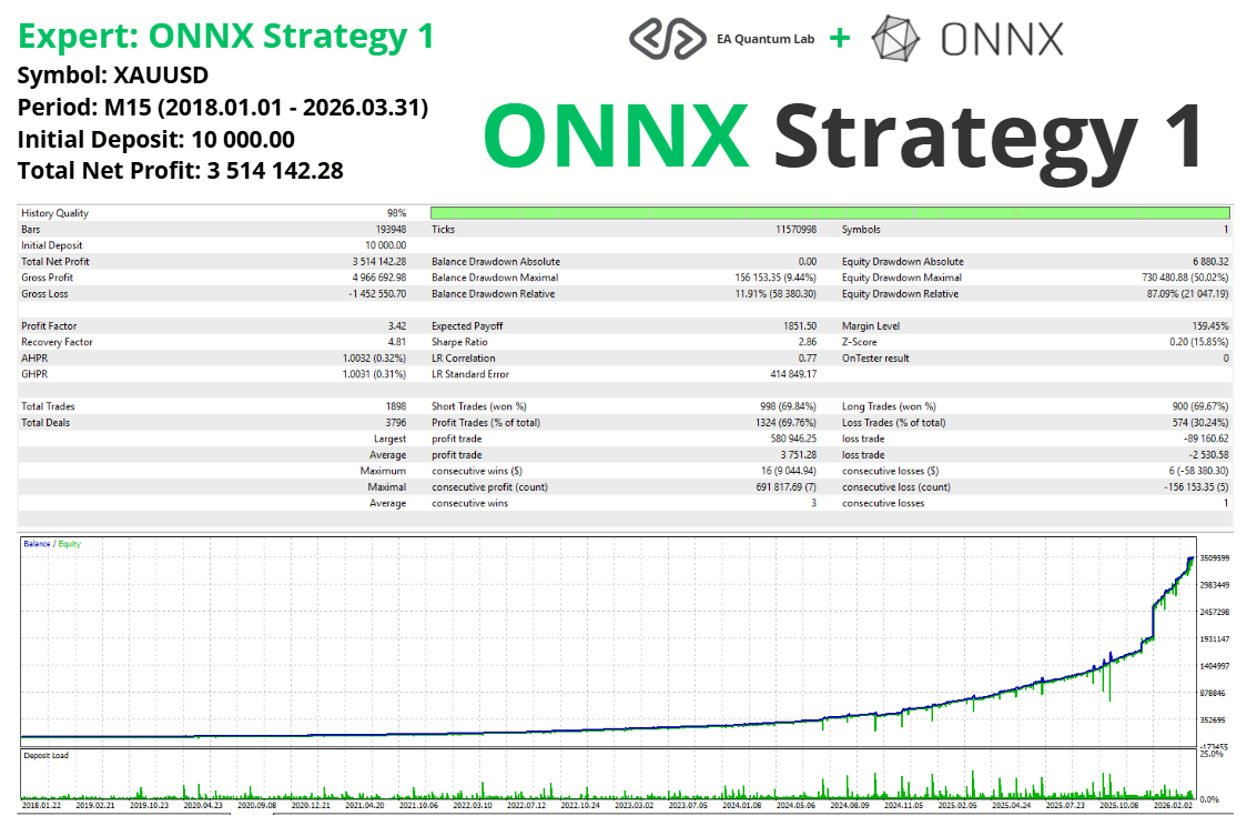 La comunidad de EA Quantum Lab presenta ONNX Strategy 1, el primer robot de trading de su tipo basado en la integración completa del formato ONNX (Open Neural Network Exchange). No se trata de un Asesor Experto cualquiera: está impulsado por redes neuronales de aprendizaje profundo que mejoran las estrategias clásicas sin modificar su lógica. Hemos entrenado cinco modelos únicos, y el primero está listo para revolucionar tu forma de operar con oro. Señal en vivo