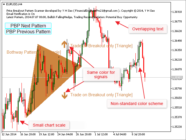 La description du produit aurait connu un succès si au lieu d'une capture d'écran, le développeur en avait fourni deux ou trois avec des images plus grandes des motifs reconnus et un texte lisible. Cela concerne aussi les grilles de prix. Choisissez des échelles plus grandes et laissez vos clients potentiels voir les détails. Nous vous déconseillons d'utiliser des schémas de couleurs inhabituels sans besoin particulier. Veuillez vous assurer que le texte du commentaire (message de la fonction commentaire) ne chevauche pas une partie du graphique. L'utilisation de couleurs standard telles que le bleu et le rouge pour mettre en évidence les signaux d'achat et de vente est ce que nous recommandons. Les données sur la capture d'écran ci-dessous ne sont pas présentées efficacement.