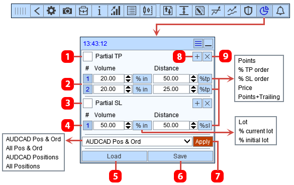 Les paramètres de fermeture partielle de ce panneau s'appliquent uniquement aux nouvelles ordres et positions. Pour appliquer les modifications aux paramètres de fermeture partielle de ce panneau aux ordres et positions déjà ouverts, cliquez sur le bouton 7 (voir ci-dessous).