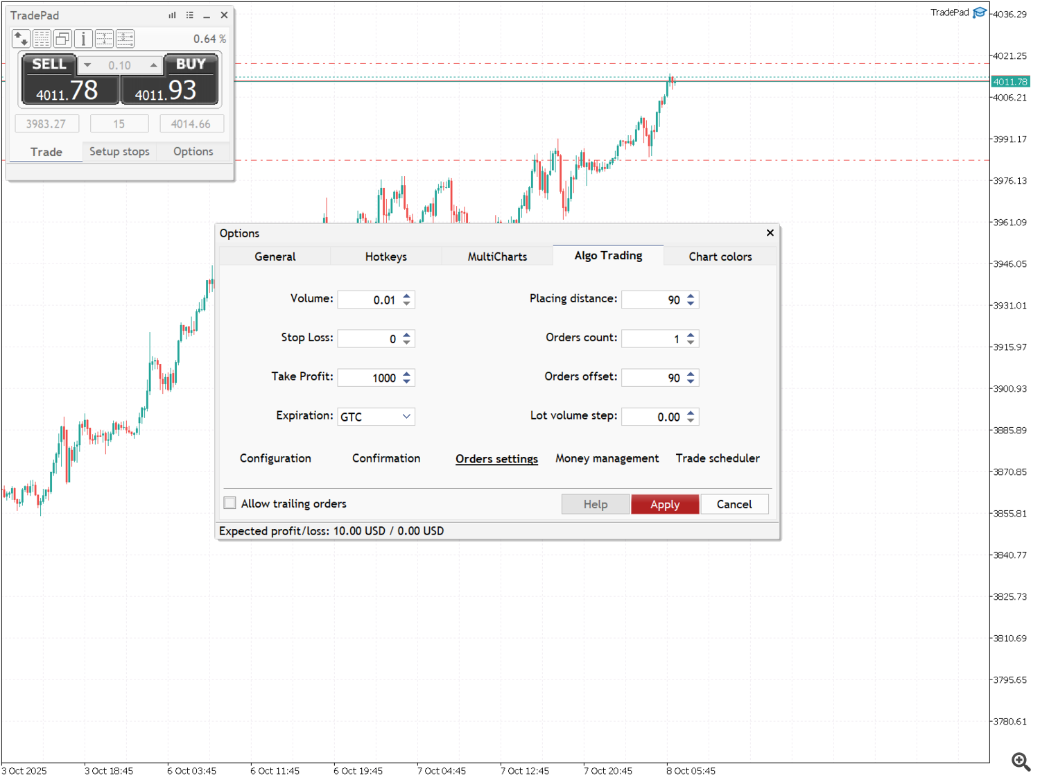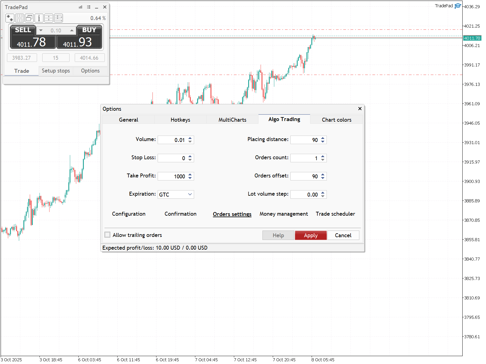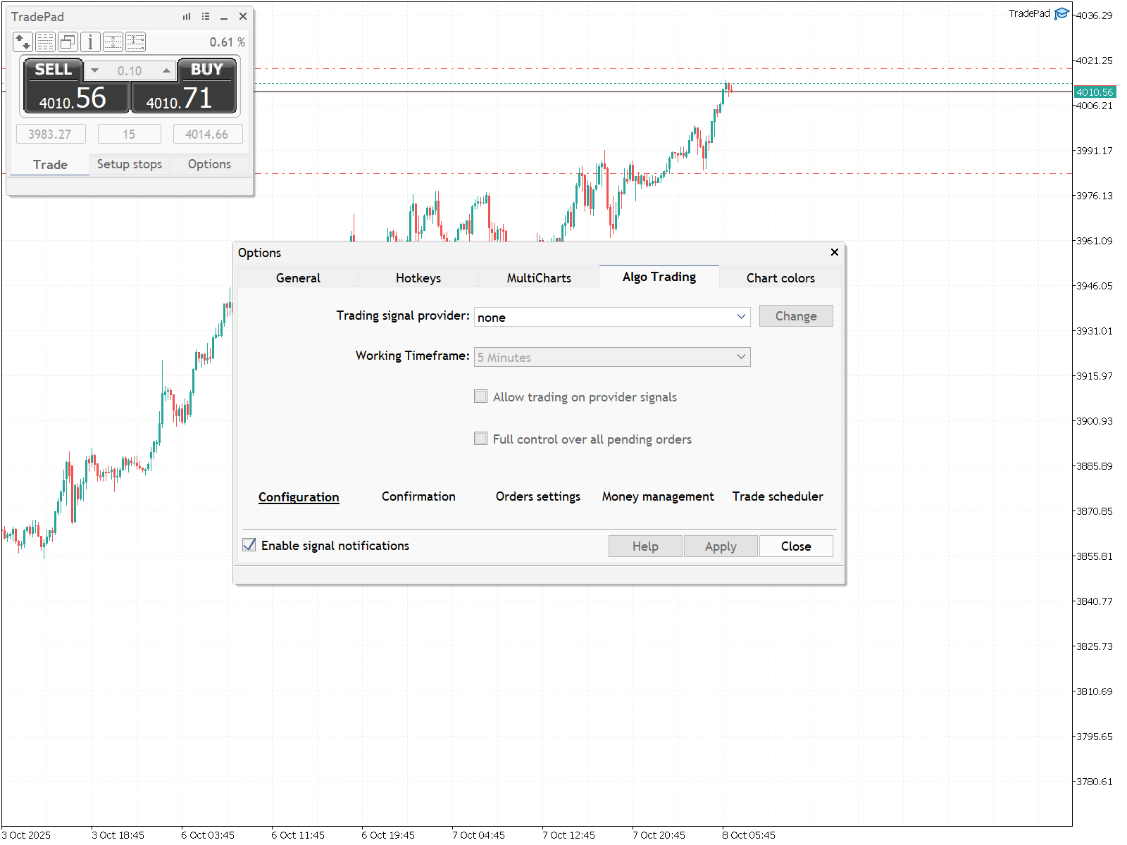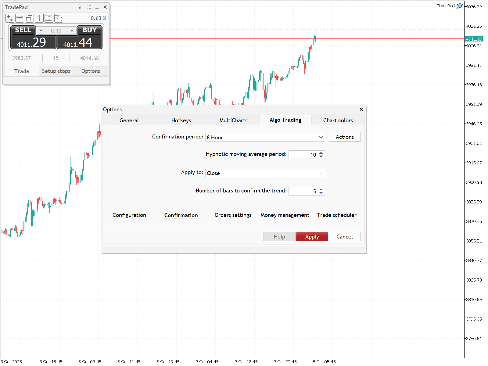 Cet onglet vous permet de configurer les paramètres du trading algorithmique. Il contient également des onglets supplémentaires: "Configuration", "Confirmation", "Orders settings", "Money management" et "Trade scheduler".