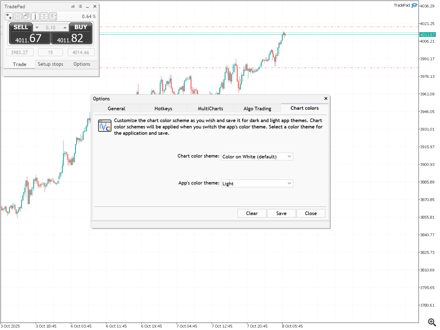 Vous pouvez ici enregistrer le jeu de couleurs principal du graphique en fonction du thème TradePad sélectionné. TradePad prend en charge deux thèmes : foncé et clair. Personnalisez les jeux de couleurs des thèmes TradePad foncé et clair selon votre perception des couleurs. Lorsque vous modifiez le thème TradePad, les jeux de couleurs que vous avez enregistrés sont appliqués. Des jeux de couleurs prédéfinis sont disponibles.