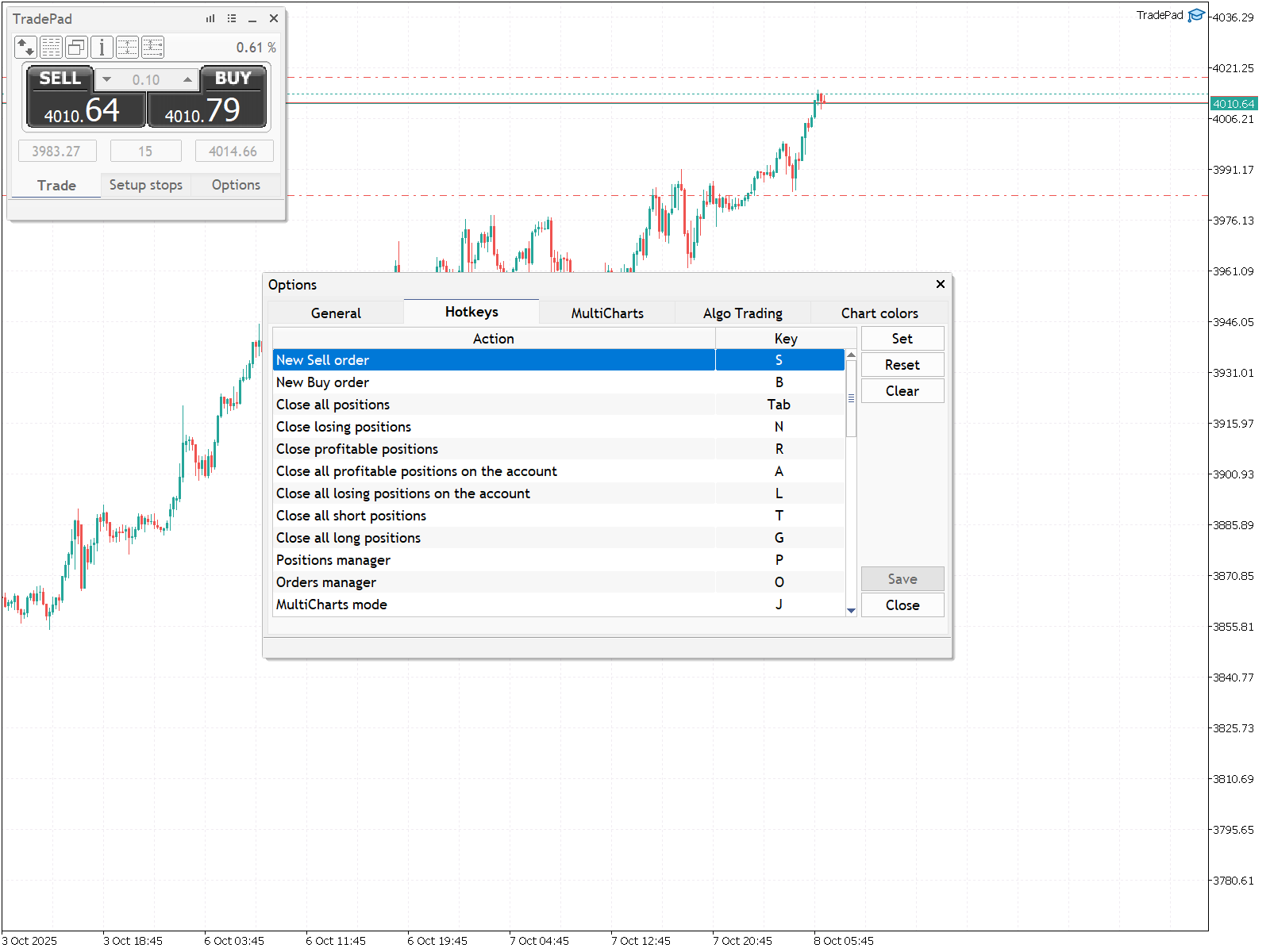 Ici, vous pouvez configurer des raccourcis clavier pour la plupart des opérations de trading, changer les périodes du graphique principal et accéder à divers outils TradePad.