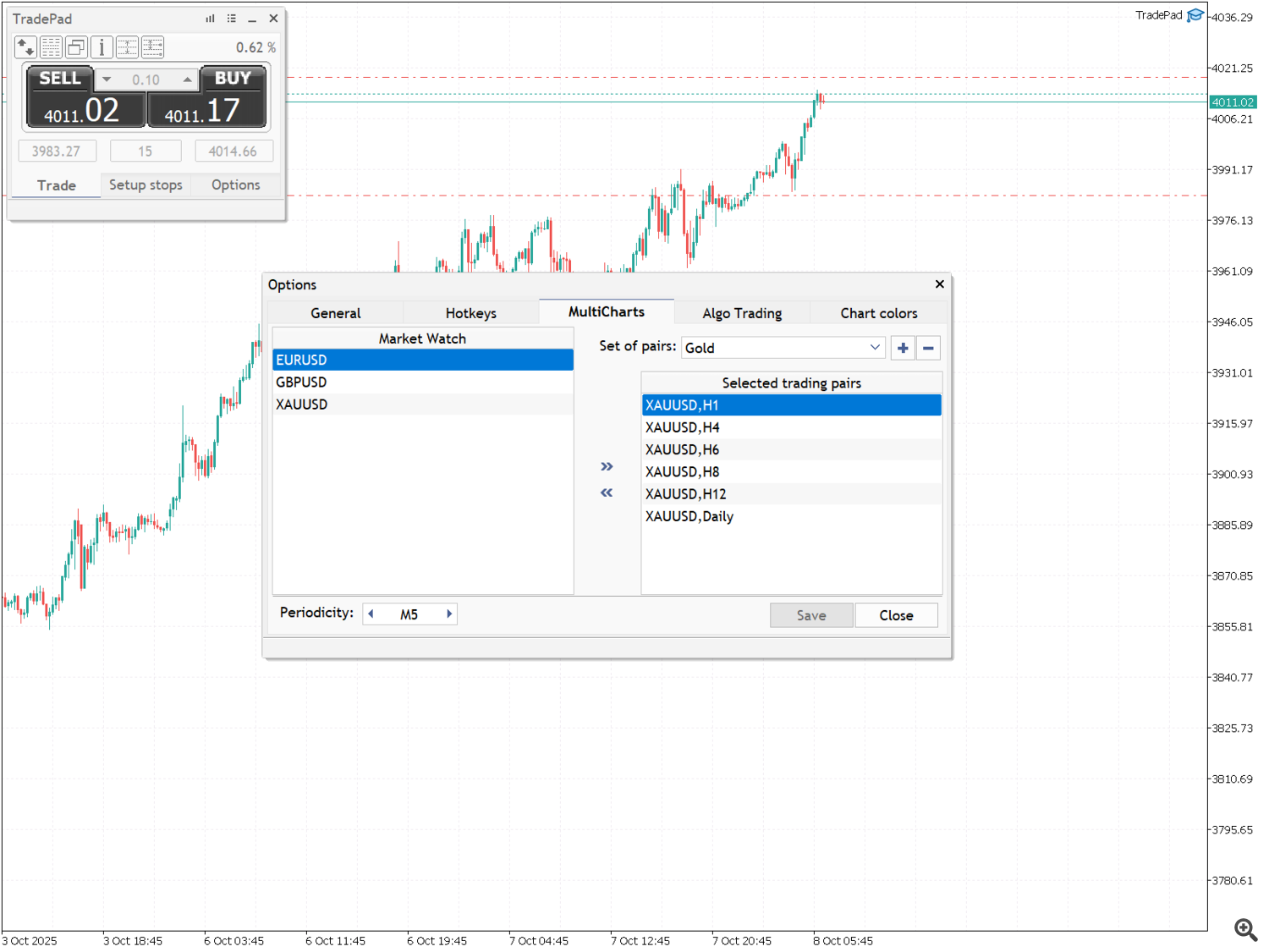 - Tabs orientation - l'emplacement des onglets des ensembles de paires de trading;