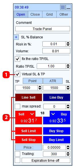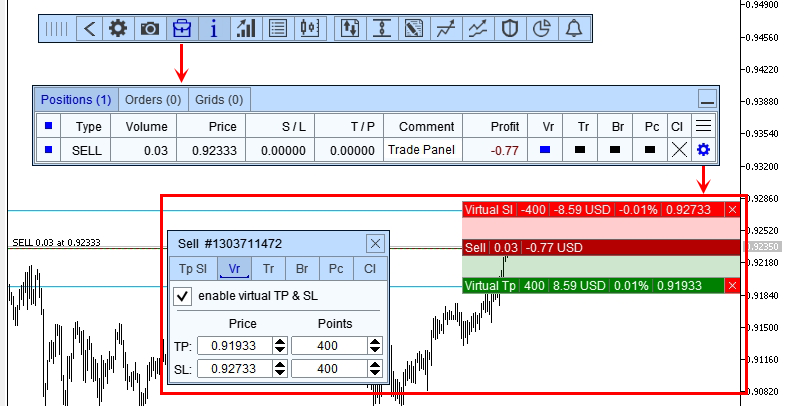 Les ordres Stop Loss et Take Profit (que nous appellerons «ordres Stop Loss et Take Profit classiques») sont stockés sur le serveur de trading du courtier et exécutés par celui-ci. Le courtier connaît donc leur emplacement. Les ordres Stop Loss et Take Profit virtuels, quant à eux, sont stockés dans TradePanel et exécutés par TradePanel. TradePanel surveille automatiquement le prix actuel et, si celui-ci atteint le stop loss ou le take profit virtuels, TradePanel clôture automatiquement la position.