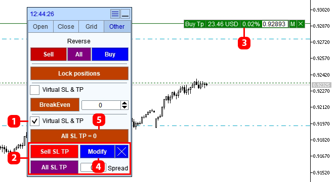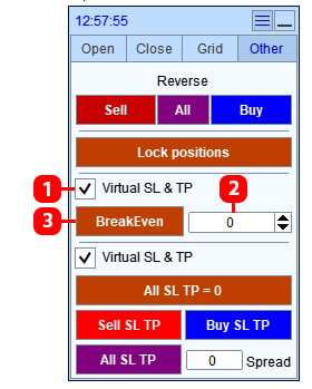✅ Pour supprimer le Stop Loss et le Take Profit virtuels pour toutes les positions, cliquez sur le bouton «All SL TP = 0».