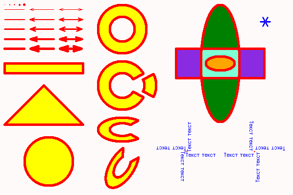 Il est possible de dessiner des points de différentes tailles - DrawDot(), des lignes par coordonnées - DrawLine(), des lignes par angle - DrawLineByAngle(), des flèches - DrawArrow(), différentes formes : rectangles - DrawRectangle(), triangles - DrawTriangle(), cercles, ellipses, anneaux, secteurs - DrawCircle(). Une ellipse peut être tournée d'un angle donné (de même qu'un anneau d'ellipse, un secteur d'ellipse). Les formes peuvent être dessinées avec un remplissage ou seulement un contour. L'impression de texte est possible - TypeText() (plusieurs options de police et de taille). L'image créée peut être enregistrée dans un fichier bmp - SavePicture(), et vous pouvez charger une image bmp prête à l'emploi à partir d'un fichier - LoadPicture() (le fichier doit être non compressé, 24 ou 32 bits).