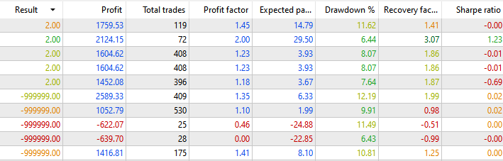 double OnTester() { // Si le nombre de réinitialisations réussies est inférieur au minimum requis ou si badResult est défini. if(successful_resets < min_won || badResult) { Print("Optimization failed: returning a highly unfavorable result."); // Renvoyer un résultat très défavorable pour gâcher la passe d'optimisation return -999999; } // Calculer la différence entre les réinitialisations réussies et les réinitialisations ratées int reset_difference = successful_resets - unsuccessful_resets; // Vérifier si la différence est négative if(reset_difference < 0) { Print("Negative difference between successful and unsuccessful resets. Returning a highly unfavorable result."); // Renvoie un résultat très défavorable si la différence est négative return -999999; } // Affichage de la différence dans le journal PrintFormat("Difference between successful and unsuccessful resets: %d", reset_difference); // Renvoyer la différence comme résultat du testeur return reset_difference; }