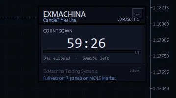 ExMachina CandleTimer Lite — Free candle countdown timer for MetaTrader 5 with the ExMachina steel palette theme.