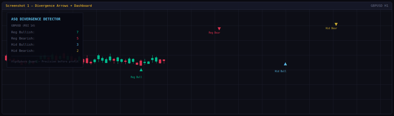 ASQ Divergence Detector scans your chart for regular and hidden RSI divergences and marks them with color-coded, non-repaint arrows. Each arrow is labeled with its type — Regular Bullish, Regular Bearish, Hidden Bullish, or Hidden Bearish — so you never have to guess what the signal means.